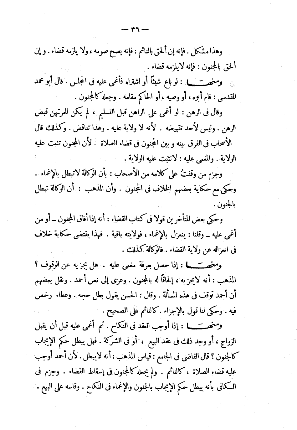 ومنها إذا أوجب العقد فى النكاح ثم أغمى عليه قبل أن يقبل الزواج أو وجد فى عقد البيع أو فى الشركة فهل يبطل حكم الإيجاب كالجنون قال القاضى فى الجامع قياس المذهب أنه لا يبطل لأن أحمد أوجب عليه قضاء الصلاة كالنائم ولم يجعله كالمجنون فى إسقاط القضاء وجزم فى الكافى بأنه يبطل حكم الإيجاب بالجنون والإغماء فى النكاح وقاسه على البيع