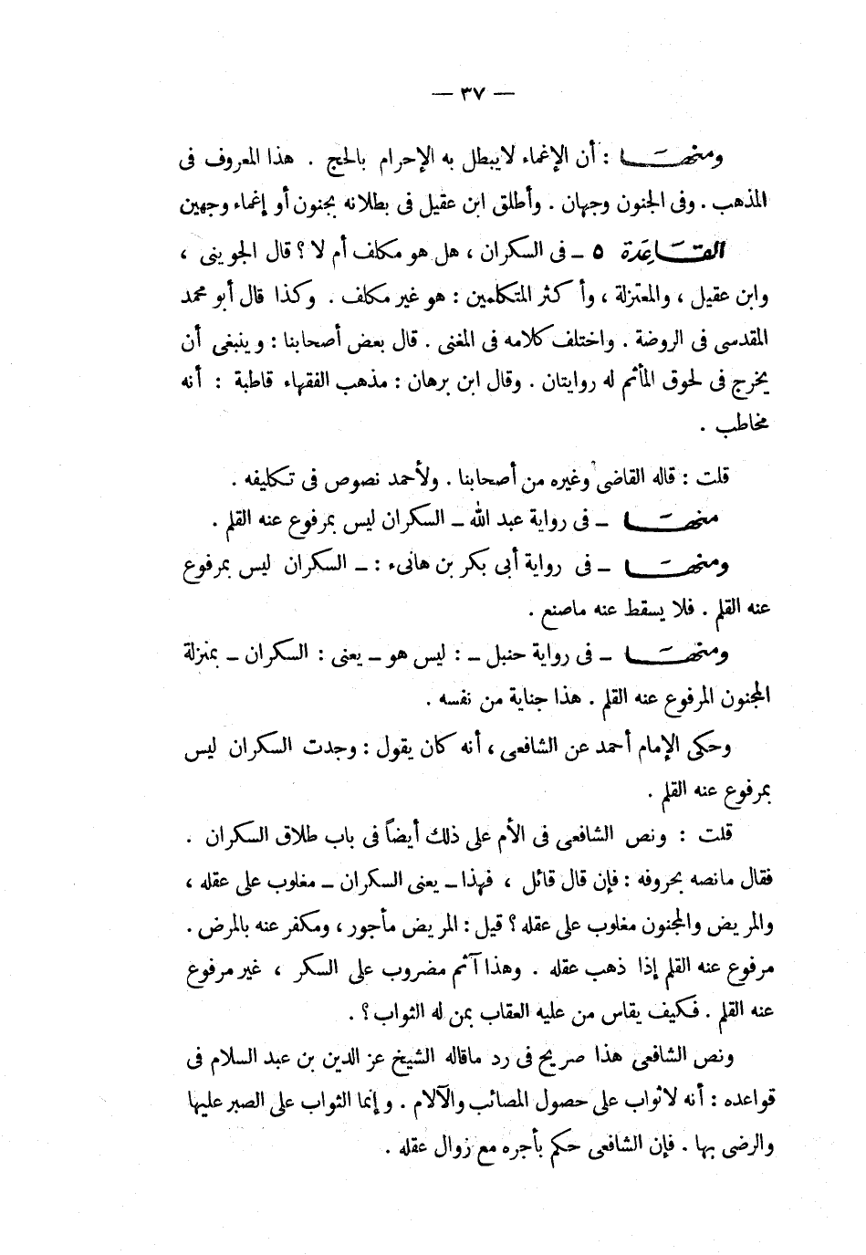 القاعدة 5 فى السكران هل هو مكلف أم لا قال الجوينى وابن عقيل والمعتزلة وأكثر المتكلمين هو غير مكلف وكذا قال أبو محمد المقدسى فى الروضة واختلف كلامه فى المغنى قال بعض أصحابنا وينبغى أن يخرج فى لحوق المأثم له روايتان وقال ابن برهان مذهب الفقهاء قاطبة أنه مخاطب