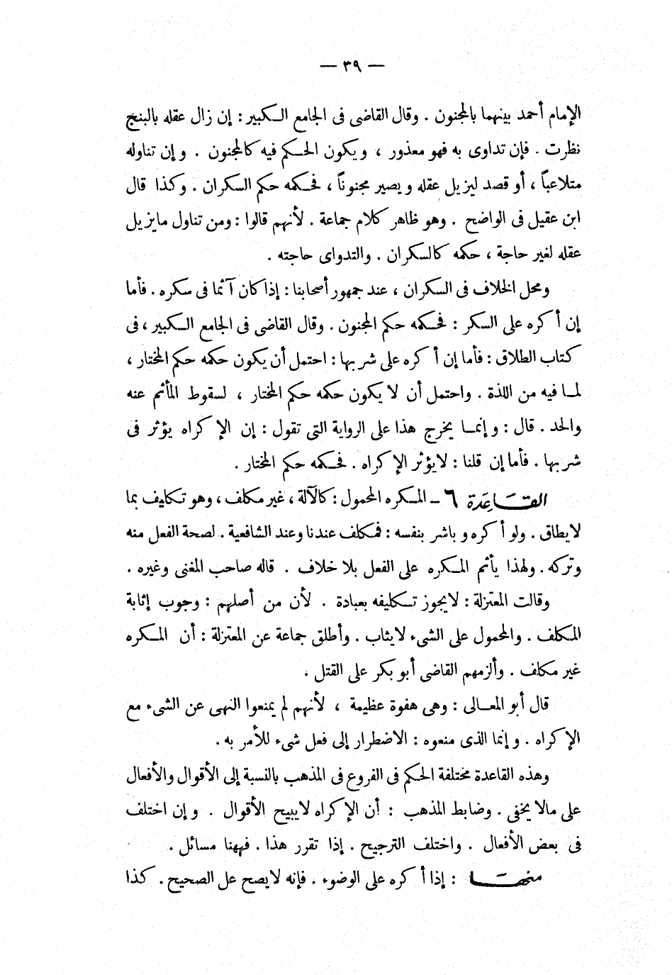 ومحل الخلاف فى السكران عند جمهور أصحابنا إذا كان آثما فى سكره فأما إن أكره على السكر فحكمه حكم المجنون وقال القاضى فى الجامع الكبير فى كتاب الطلاق فأما إن أكره على شربها احتمل أن يكون حكمه حكم المختار لما فيه من اللذة واحتمل أن لا يكون حكمه حكم المختار لسقوط المأثم عنه والحد قال وإنما يخرج هذا على الرواية التى تقول إن الإكراه يؤثر فى شربها فأما إن قلنا لا يؤثر الإكراه فحكمه حكم المختار