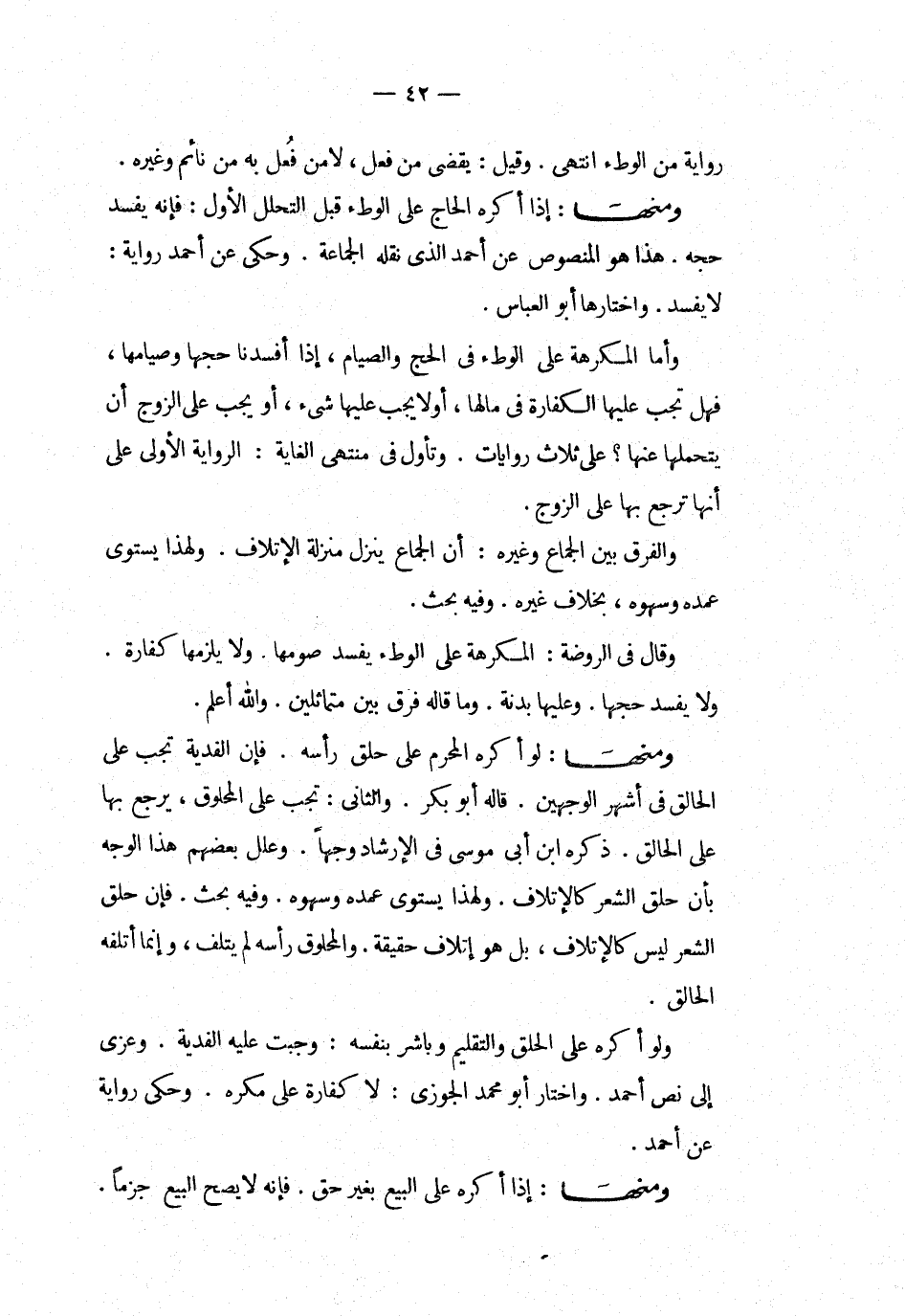 ومنها إذا أكره الحاج على الوطء قبل التحلل الاول فانه يفسد حجه هذا هو المنصوص عن أحمد الذى نقله الجماعة وحكى عن أحمد رواية لا يفسد واختارها أبو العباس