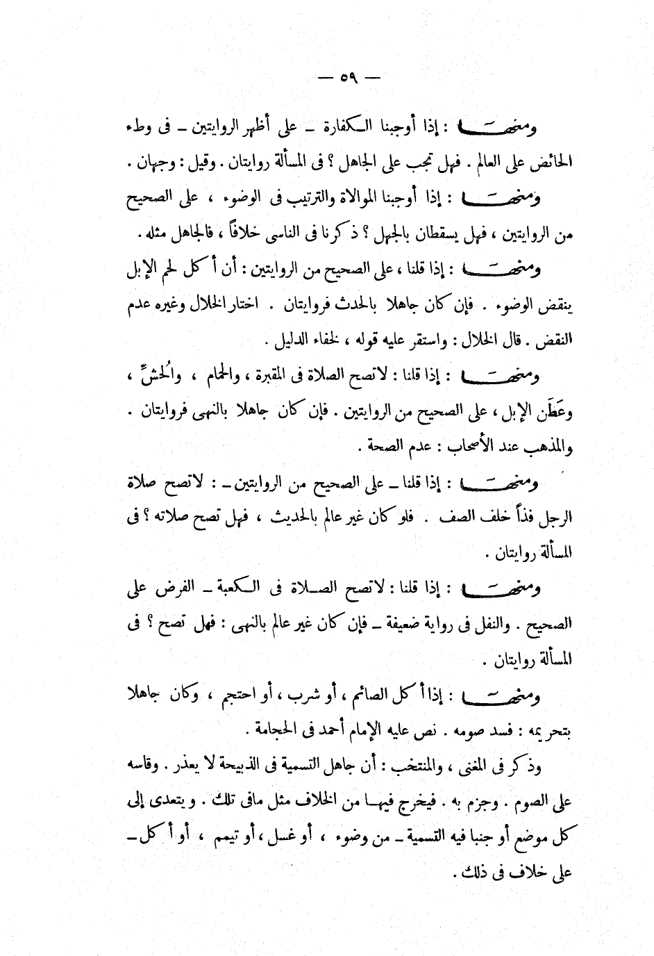 ومنها إذا قلنا على الصحيح من الروايتين لا تصح صلاة الرجل فذا خلف الصف فلو كان غير عالم بالحديث فهل تصح صلاته فى المسألة روايتان