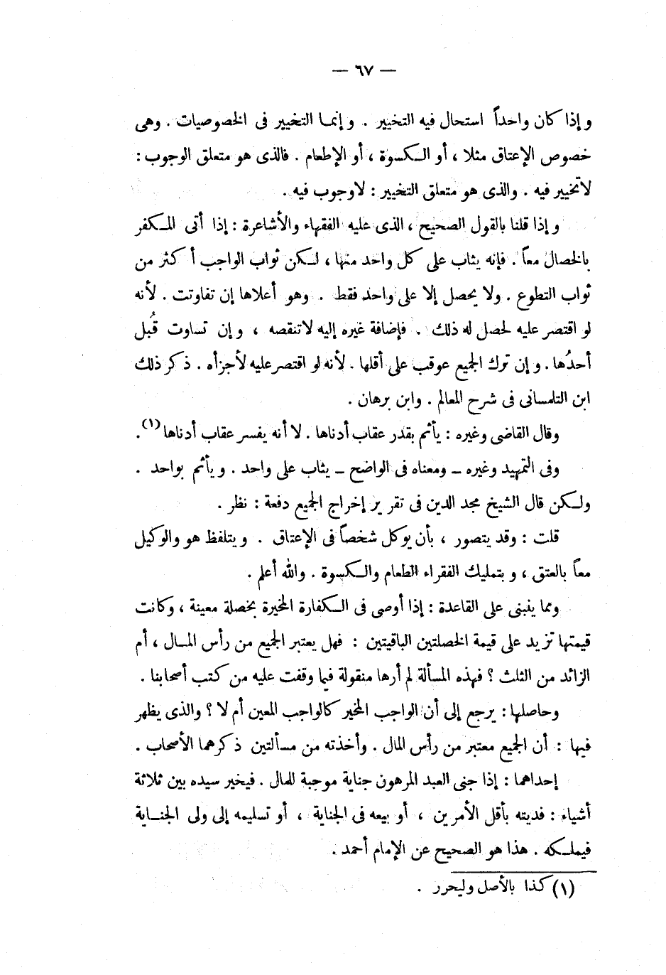 وإذا كان واحدا استحال فيه التخيير وانما التخيير فى الخصوصيات وهى خصوص الإعتاق مثلا أو الكسوة أو الإطعام فالذى هو متعلق الوجوب لا تخيير فيه والذى هو متعلق التخيير لا وجوب فيه