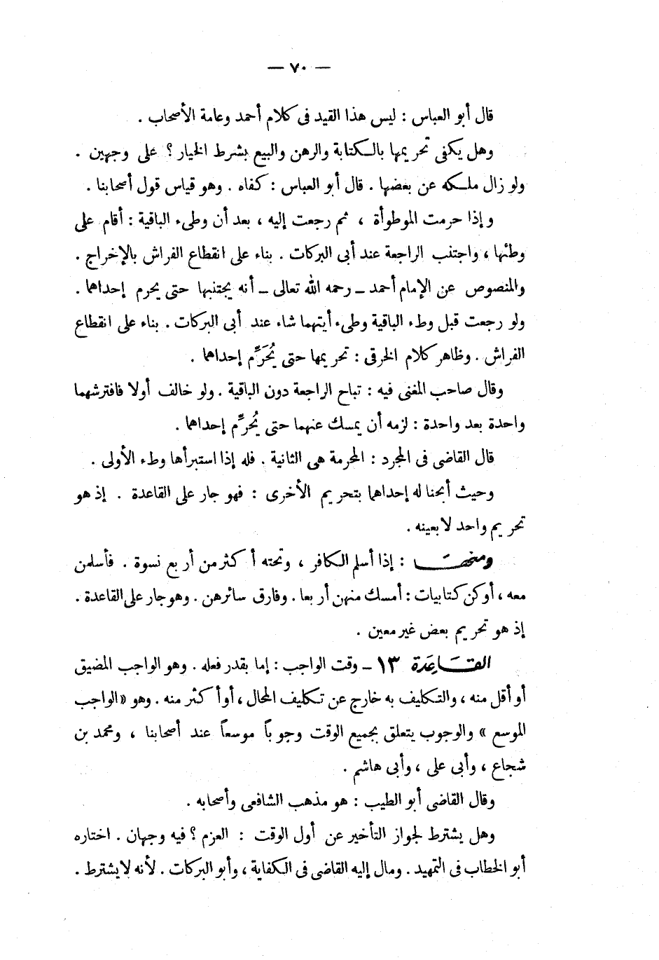 القاعدة 13 وقت الواجب إما بقدر فعله وهو الواجب المضيق أو أقل منه والتكليف به خارج عن تكليف المحال أو أكثر منه وهو الواجب الموسع والوجوب يتعلق بجميع الوقت وجوبا موسعا عند أصحابنا ومحمد بن شجاع وأبى على وأبى هاشم