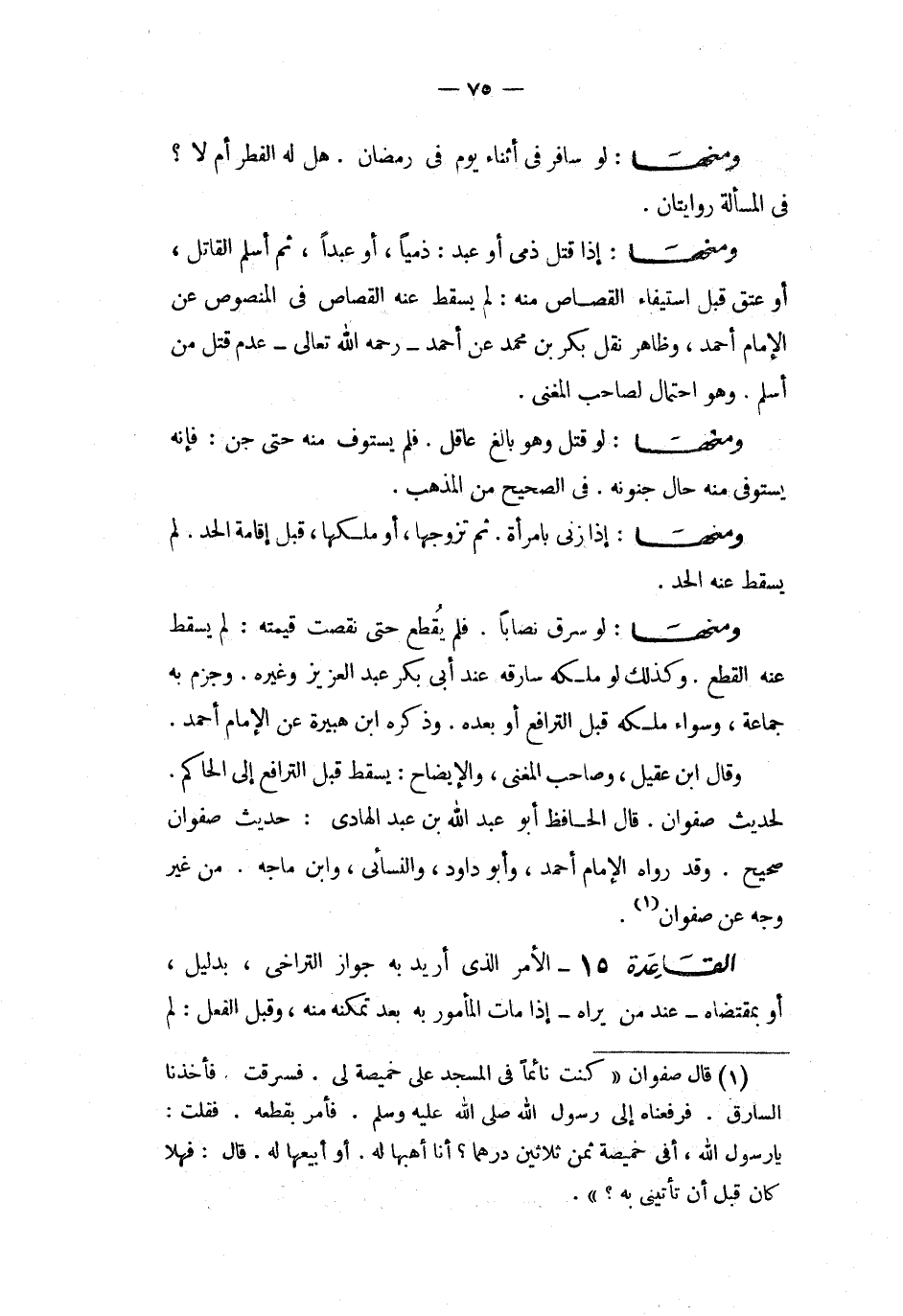 ومنها إذا قتل ذمى أو عبدا ذميا ثم أسلم القاتل أو عتق قبل استيفاء القصاص منه لم يسقط عنه القصاص فى المنصوص عن الإمام أحمد وظاهر نقل بكر بن محمد عن أحمد رحمه الله تعالى عدم قتل من أسلم وهو احتمال لصاحب المغنى