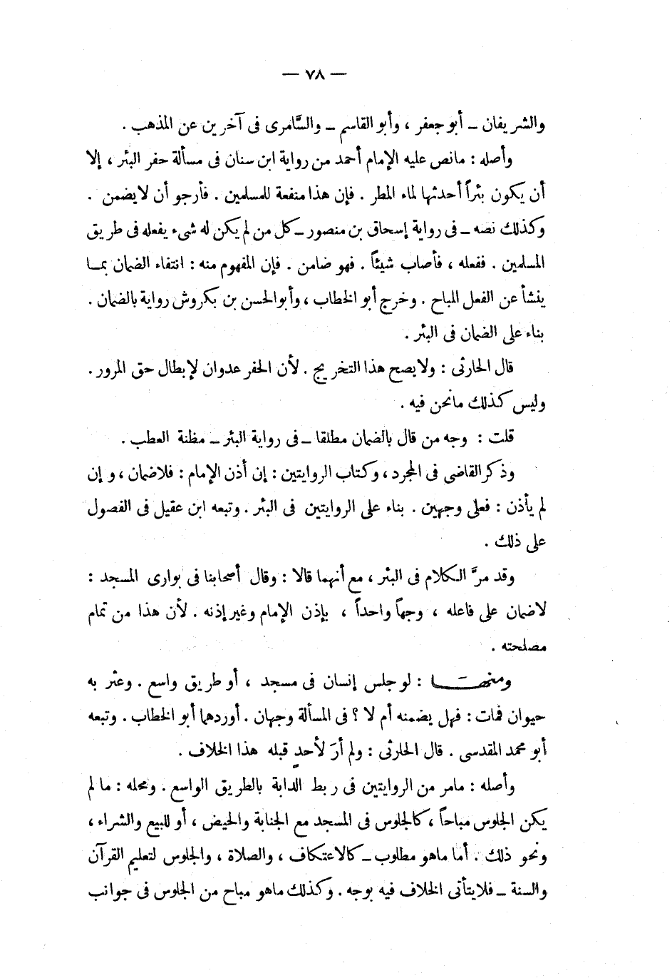 وأصله ما نص عليه الإمام أحمد من رواية ابن سنان فى مسألة حفر البئر إلا أن يكون بئرا أحدثها لماء المطر فإن هذا منفعة للمسلمين فأرجوا أن لا يضمن وكذلك نصه فى رواية إسحاق بن منصور كل من لم يكن له شيء يفعله فى طريق المسلمين ففعله فأصاب شيئا فهو ضامن فإن المفهوم منه انتفاء الضمان بما ينشأ عن الفعل المباح وخرج أبو الخطاب وأبو الحسن بن بكروش رواية بالضمان بناء على الضمان فى البئر