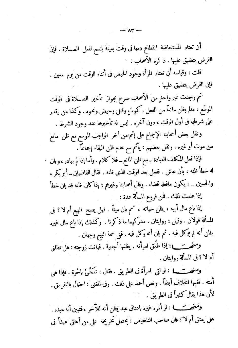 فإذا فعل المكلف العبادة مع ظن المانع فلا كلام وأما إذا لم يبادر وبان له خطأ ظنه بأن عاش ففعل بعد الوقت الذى ظنه فقال القاضيان أبو بكر والحسين يكون ما فعله قضاء وقال أصحابنا وغيرهم إذا كان ظنه قد بان خطأ إذا علمت ذلك فمن فروع المسألة عدة