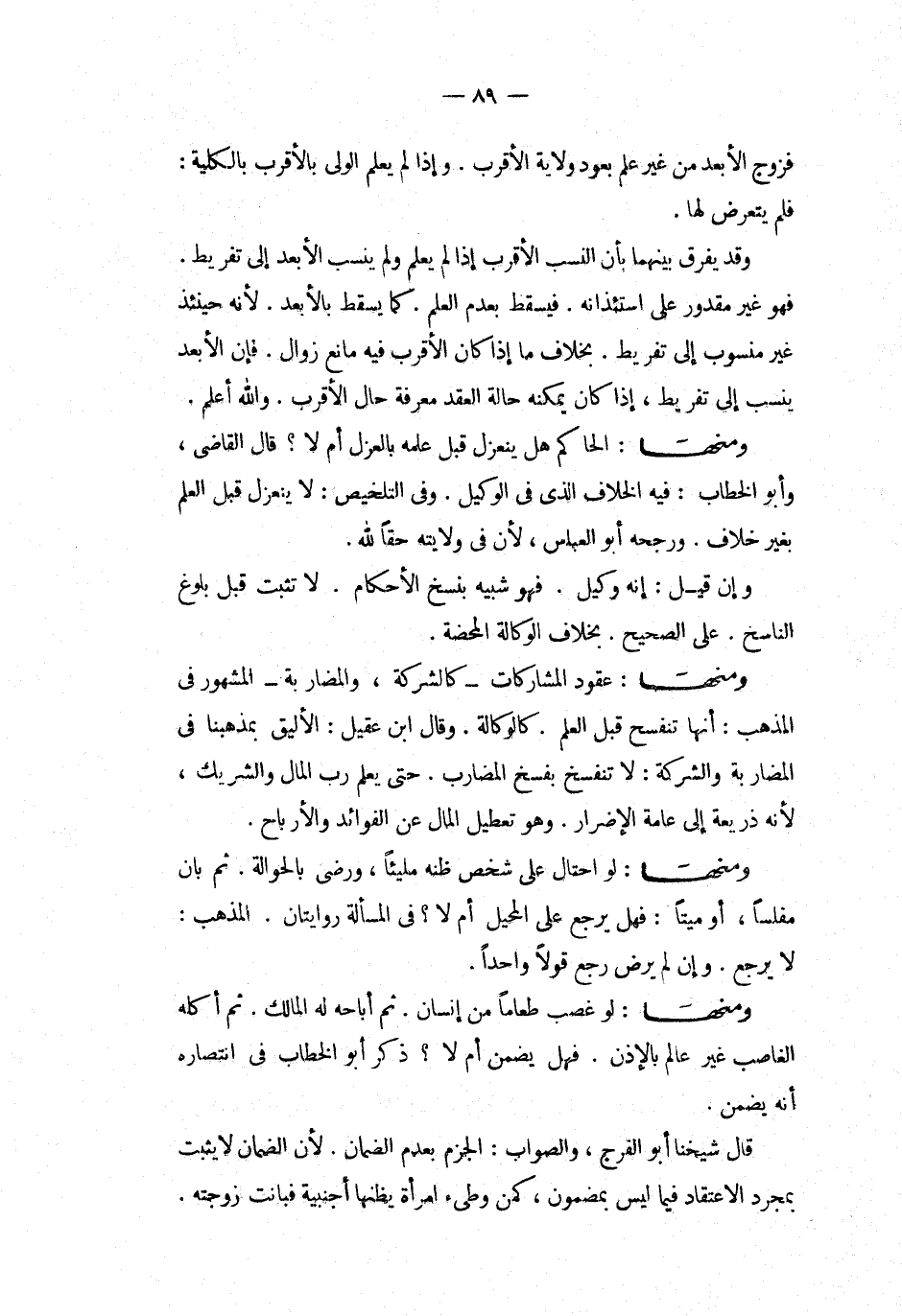 ومنها عقود المشاركات كالشركة والمضاربة المشهور فى المذهب أنها تنفسخ قبل العلم كالوكالة وقال ابن عقيل الأليق بمذهبنا فى المضاربة والشركة لا تنفسخ بفسخ المضارب حتى يعلم رب المال والشريك لأنه ذريعة إلى عامة الإضرار وهو تعطيل المال عن الفوائد والأرباح