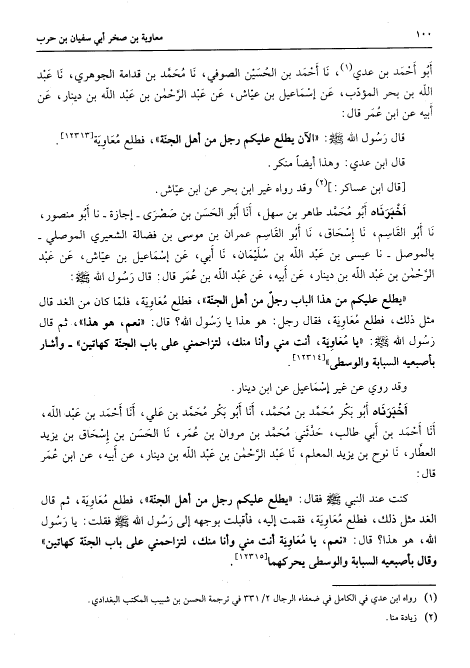 أبو أحمد بن عدي (1) نا أحمد بن الحسين الصوفي نا محمد بن قدامة الجوهري نا عبد الله بن بحر المؤدب عن إسماعيل بن عياش عن عبد الرحمن بن عبد الله بن دينار عن أبيه عن ابن عمر قال قال رسول الله (صلى الله عليه وسلم) الآن يطلع عليكم رجل من أهل الجنة فطلع معاوية قال ابن عدي وهذا أيضا منكر قال ابن عساكر (2) وقد رواه غير ابن بحر عن ابن عياش أخبرناه أبو محمد طاهر بن سهل أنا أبو الحسن بن صصرى إجازة نا أبو منصور نا أبو القاسم نا إسحاق نا أبو القاسم عمران بن موسى بن فضالة الشعيري الموصلي بالموصل نا عيسى بن عبد الله بن سليمان نا أبي عن إسماعيل بن عياش عن عبد الرحمن بن عبد الله بن دينار عن أبيه عن عبد الله بن عمر قال قال رسول الله (صلى الله عليه وسلم) يطلع عليكم من هذا الباب رجل من أهل الجنة فطلع معاوية فلما كان من الغد قال مثل ذلك فطلع معاوية فقال رجل هو هذا يا رسول الله قال نعم هو هذا ثم قال رسول الله (صلى الله عليه وسلم) يا معاوية أنت مني وأنا منك لتزاحمني على باب الجنة كهاتين وأشار بإصبعيه السبابة والوسطى وقد روي عن غير إسماعيل عن ابن دينار أخبرناه أبو بكر محمد بن محمد أنا أبو بكر محمد بن علي أنا أحمد بن عبد الله أنا أحمد بن أبي طالب حدثني محمد بن مروان بن عمر نا الحسن بن إسحاق بن يزيد العطار نا نوح بن يزيد المعلم نا عبد الرحمن بن عبد الله بن دينار عن أبيه عن ابن عمر قال كنت عند النبي (صلى الله عليه وسلم) فقال يطلع عليكم رجل من أهل الجنة فطلع معاوية ثم قال الغد مثل ذلك فطلع معاوية فقمت إليه فأقبلت بوجهه إلى رسول الله (صلى الله عليه وسلم) فقلت يا رسول الله هو هذا قال نعم يا معاوية أنت مني وأنا منك لتزاحمني على باب الجنة كهاتين وقال بأصبعيه السبابة والوسطي يحركهما