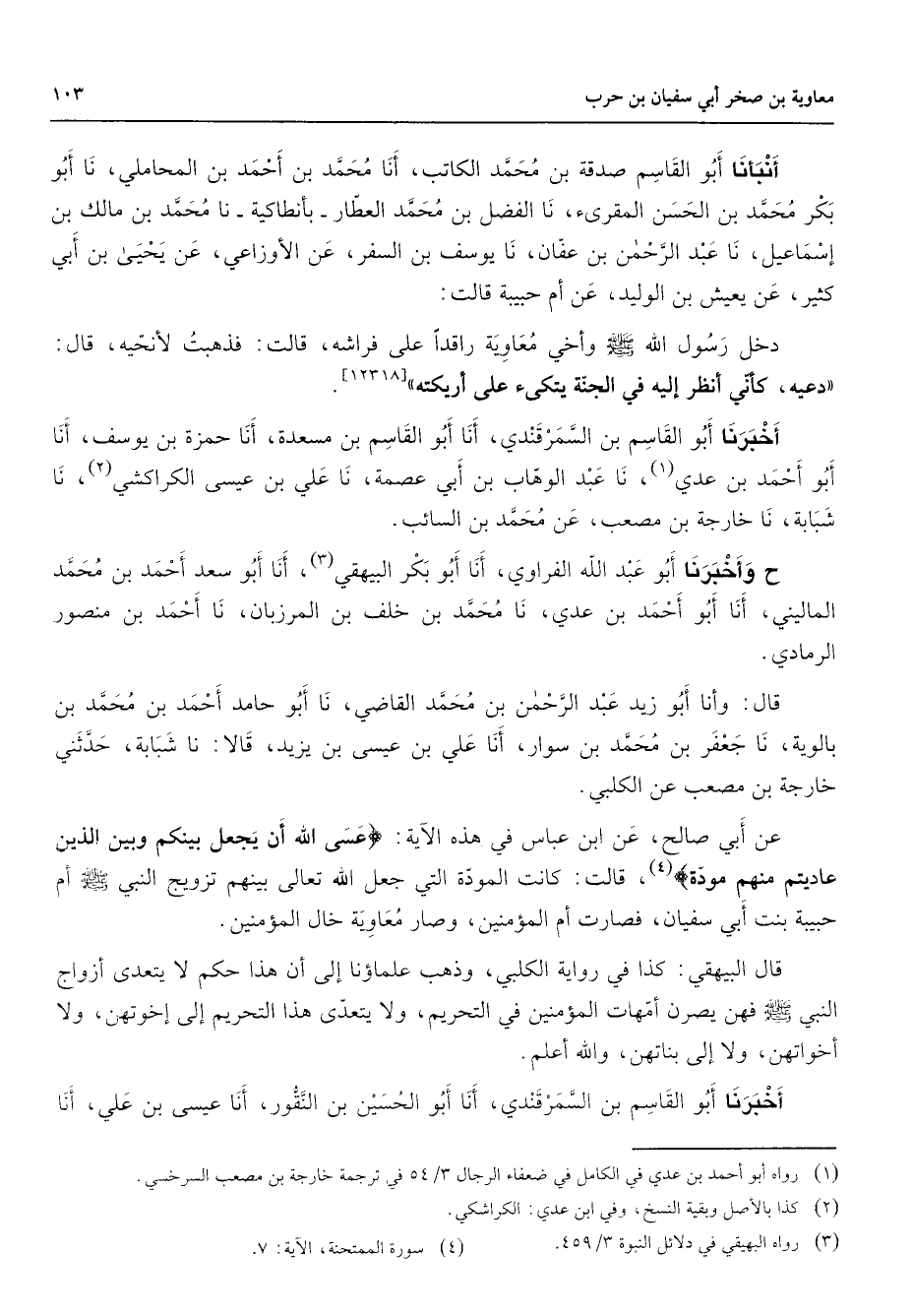 أنبأنا أبو القاسم صدقة بن محمد الكاتب أنا محمد بن أحمد بن المحاملي نا أبو بكر محمد بن الحسن المقرئ نا الفضل بن محمد العطار بأنطاكية نا محمد بن مالك بن إسماعيل نا عبد الرحمن بن عفان نا يوسف بن السفر عن الأوزاعي عن يحيى بن أبي كثير عن يعيش بن الوليد عن أم حبيبة قالت دخل رسول الله (صلى الله عليه وسلم) وأخي معاوية راقدا على فراشه قالت فذهبت لأنحيه قال دعيه كأني أنظر إليه في الجنة يتكئ على أريكته أخبرنا أبو القاسم بن السمرقندي أنا أبو القاسم بن مسعدة أنا حمزة بن يوسف أنا أبو أحمد بن عدي (1) نا عبد الوهاب بن أبي عصمة نا علي بن عيسى الكراكشي (2) نا شبابة نا خارجة بن مصعب عن محمد بن السائب ح وأخبرنا أبو عبد الله الفراوي أنا أبو بكر البيهقي (3) أنا أبو سعد أحمد بن محمد الماليني أنا أبو أحمد بن عدي نا محمد بن خلف بن المرزبان نا أحمد بن منصور الرمادي قال وأنا أبو زيد عبد الرحمن بن محمد القاضي نا أبو حامد أحمد بن محمد بن بالوية نا جعفر بن محمد بن سوار أنا علي بن عيسى بن يزيد قالا نا شبابة حدثني خارجة بن مصعب عن الكلبي عن أبي صالح عن ابن عباس في هذه الآية " عسى الله أن يجعل بينكم وبين الذين عاديتم منهم مودة (4) قالت كانت المودة التي جعل الله تعالى بينهم تزويج النبي (صلى الله عليه وسلم) أم حبيبة بنت أبي سفيان فصارت أم المؤمنين وصار معاوية خال المؤمنين قال البيهقي كذا في رواية الكلبي وذهب علماؤنا إلى أن هذا حكم لا يتعدى أزواج النبي (صلى الله عليه وسلم) فهن يصرن أمهات المؤمنين في التحريم ولا يتعدى هذا التحريم إلى إخوتهن ولا أخواتهن ولا إلى بناتهن والله أعلم أخبرنا أبو القاسم بن السمرقندي أنا أبو الحسين بن النقور أنا عيسى بن علي أنا