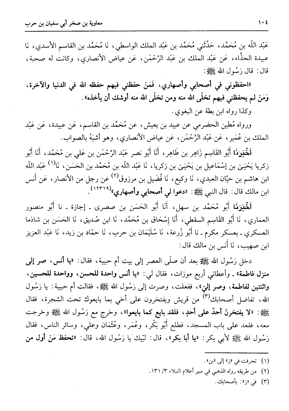 عبد الله بن محمد حدثني محمد بن عبد الملك الواسطي نا محمد بن القاسم الأسدي نا عبيدة الحذاء عن عبد الملك بن عبد الرحمن عن عياض الأنصاري وكانت له صحبة قال قال رسول الله (صلى الله عليه وسلم) احفظوني في أصحابي وأصهاري فمن حفظني فيهم حفظه الله في الدنيا والآخرة ومن لم يحفظني فيهم تخلى الله منه ومن تخلى الله منه أوشك أن يأخذه وكذا رواه ابن بطة عن البغوي ورواه مطين الحضرمي عن عبيد الله بن يعيش عن محمد بن القاسم عن عبيدة عن عبد الملك بن عمير عن عبد الرحمن عن عياض الأنصاري وهو أشبه بالصواب أخبرنا أبو القاسم زاهر بن طاهر أنا أبو نصر عبد الرحمن بن علي بن محمد أنا أبو زكريا يحيى بن إسماعيل بن يحيى بن زكريا نا عبد الله بن محمد بن الحسن نا (1) عبد الله ابن هاشم بن حيان العبدي نا وكيع نا فضيل بن مرزوق (2) عن رجل من الأنصار عن أنس ابن مالك قال قال النبي (صلى الله عليه وسلم) دعوا لي أصحابي وأصهاري أخبرنا أبو محمد بن سهل أنا أبو الحسن بن صصرى إجازة نا أبو منصور العماري نا أبو القاسم السقطي أنا إسحاق بن محمد نا ابن صديق نا الحسن بن شاذما العسكري بعسكر مكرم نا أبو زرعة نا سليمان بن حرب نا حماد بن زيد نا عبد العزيز ابن صهيب نا أنس بن مالك قال دخل رسول الله (صلى الله عليه وسلم) بعد أن صلى العصر إلى بيت أم حبيبة فقال يا أنس صر إلى منزل فاطمة وأعطاني أربع موزات فقال لي يا أنس واحدة للحسن وواحدة للحسين واثنتين لفاطمة وصر إلي ففعلت وصرت إلى رسول الله (صلى الله عليه وسلم) فقالت أم حبيبة يا رسول الله تفاضل أصحابك (3) من قريش ويفتخرون على أخي بما بايعوك تحت الشجرة فقال (صلى الله عليه وسلم) لا يفتخرن أحد على أحد فلقد بايع كما بايعوا وخرج مع رسول الله (صلى الله عليه وسلم) وخرجت معه فقعد على باب المسجد فطلع أبو بكر وعمر وعثمان وعلي وسائر الناس فقال رسول الله (صلى الله عليه وسلم) لأبي بكر يا أبا بكر قال لبيك يا رسول الله قال تحفظ من أول من