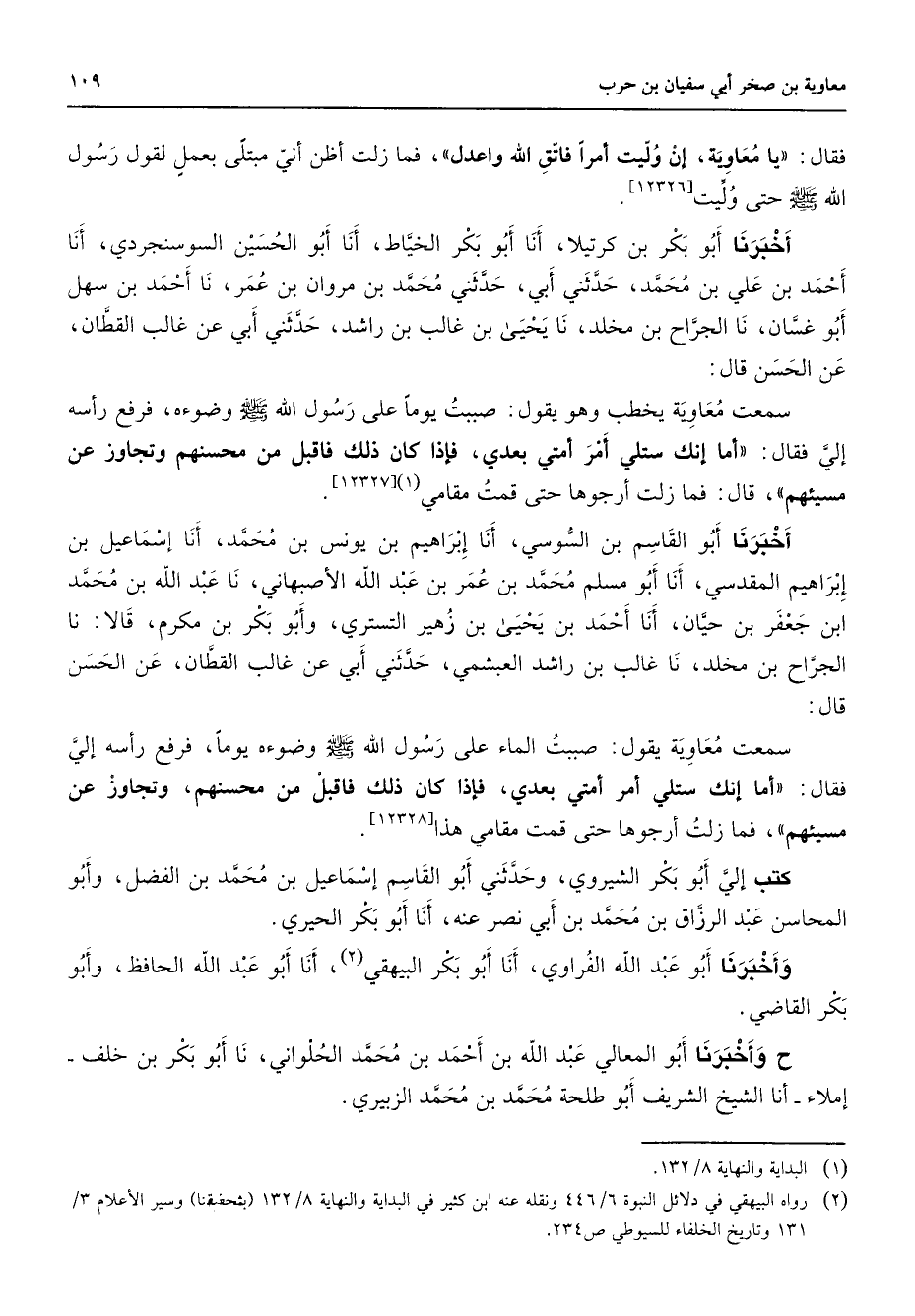 فقال يا معاوية إن وليت أمرا فاتق الله واعدل فما زلت أظن أني مبتلى بعمل لقول رسول الله (صلى الله عليه وسلم) حتى وليت أخبرنا أبو بكر بن كرتيلا أنا أبو بكر الخياط أنا أبو الحسين السوسنجردي أنا أحمد بن علي بن محمد حدثني أبي حدثني محمد بن مروان بن عمر نا أحمد بن سهل أبو غسان نا الجراح بن مخلد نا يحيى بن غالب بن راشد حدثني أبي عن غالب القطان عن الحسن قال سمعت معاوية يخطب وهو يقول صببت يوما على رسول الله (صلى الله عليه وسلم) وضوءه فرفع رأسه إلي فقال أما إنك ستلي أمر أمتي بعدي فإذا كان ذلك فاقبل من محسنهم وتجاوز عن مسيئهم قال فما زلت أرجوها حتى قمت مقامي (1) أخبرنا أبو القاسم بن السوسي أنا إبراهيم بن يونس بن محمد أنا إسماعيل بن إبراهيم المقدسي أنا أبو مسلم محمد بن عمر بن عبد الله الأصبهاني نا عبد الله بن محمد ابن جعفر بن حيان أنا احمد بن يحيى بن زهير التستري وأبو بكر بن مكرم قالا نا الجراح بن مخلد نا غالب بن راشد العبشمي حدثني أبي عن غالب القطان عن الحسن قال سمعت معاوية يقول صببت الماء على رسول الله (صلى الله عليه وسلم) وضوءه يوما فرفع رأسه إلي فقال أما إنك ستلي أمر أمتي بعدي فإذا كان ذلك فاقبل من محسنهم وتجاوز عن مسيئهم فما زلت أرجوها حتى قمت مقامي هذا كتب إلي أبو بكر الشيروي وحدثني أبو القاسم إسماعيل بن محمد بن الفضل وأبوالمحاسن عبد الرزاق بن محمد بن أبي نصر عنه أنا أبو بكر الحيري وأخبرنا أبو عبد الله الفراوي أنا أبو بكر البيهقي (2) أنا أبو عبد الله الحافظ وأبو بكر القاضي ح وأخبرنا أبو المعالي عبد الله بن أحمد بن محمد الحلواني نا أبو بكر بن خلف إملاء أنا الشيخ الشريف أبو طلحة محمد بن محمد الزبيري
