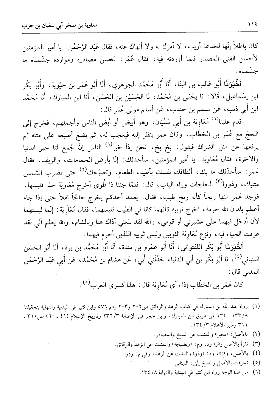 (1) رواه عبد الله بن المبارك في كتاب الزهد والرقائق ص 202 و 203 رقم 576 وابن كثير في البداية والنهاية بتحقيقنا 8 / 133 - 134 من طريق ابن المبارك وابن حجر في الاصابة 3 / 232 وتاريخ الاسلام (41 - 60) ص 310 - 311 وسير الاعلام 3 / 134