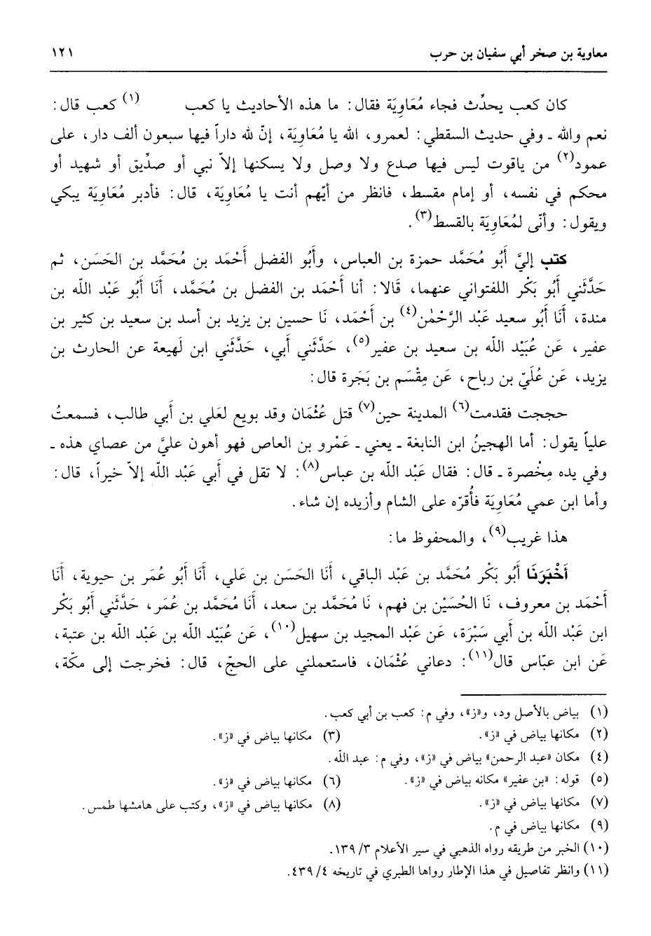 كان كعب يحدث فجاء معاوية فقال ما هذه الأحاديث يا كعب (1) كعب قال نعم والله وفي حديث السقطي لعمرو الله يا معاوية إن لله دارا فيها سبعون ألف دار على عمود (2) من ياقوت ليس فيها صدع ولا وصل ولا يسكنها إلا نبي أو صديق أو شهيد أو محكم في نفسه أو إمام مقسط فانظر من أيهم أنت يا معاوية قال فأدبر معاوية يبكي ويقول وأنى لمعاوية بالقسط (3) كتب إلي أبو محمد حمزة بن العباس وأبو الفضل أحمد بن محمد بن الحسن ثم حدثني أبو بكر اللفتواني عنهما قال أنا أحمد بن الفضل بن محمد أنا أبو عبد الله بن مندة أنا أبو سعيد عبد الرحمن (4) بن أحمد نا حسين بن يزيد بن أسد بن سعيد بن كثير بن عفير عن عبيد الله بن سعيد بن عفير (5) حدثني أبي حدثني ابن لهيعة عن الحارث بن يزيد عن علي بن رباح عن مقسم بن بجرة قال حججت فقدمت (6) المدينة حين (7) قتل عثمان وقد بويع لعلي بن أبي طالب فسمعت عليا يقول أما الهجين ابن النابغة يعني عمرو بن العاص فهو أهون علي من عصاي هذه وفي يده مخصرة قال فقال عبد الله بن عباس (8) لا تقل في أبي عبد الله إلا خيرا قال وأما ابن عمي معاوية فأقره على الشام وأزيده إن شاء هذا غريب (9) والمحفوظ ما أخبرنا أبو بكر محمد بن عبد الباقي أنا الحسن بن علي أنا أبو عمر بن حيوية أنا أحمد بن معروف نا الحسين بن فهم نا محمد بن سعد أنا محمد بن عمر حدثني أبو بكر ابن عبد الله بن أبي سبرة عن عبد المجيد بن سهيل (10) عن عبيد الله بن عبد الله بن عتبة عن ابن عباس قال (11) دعاني عثمان فاستعملني على الحج قال فخرجت إلى مكة