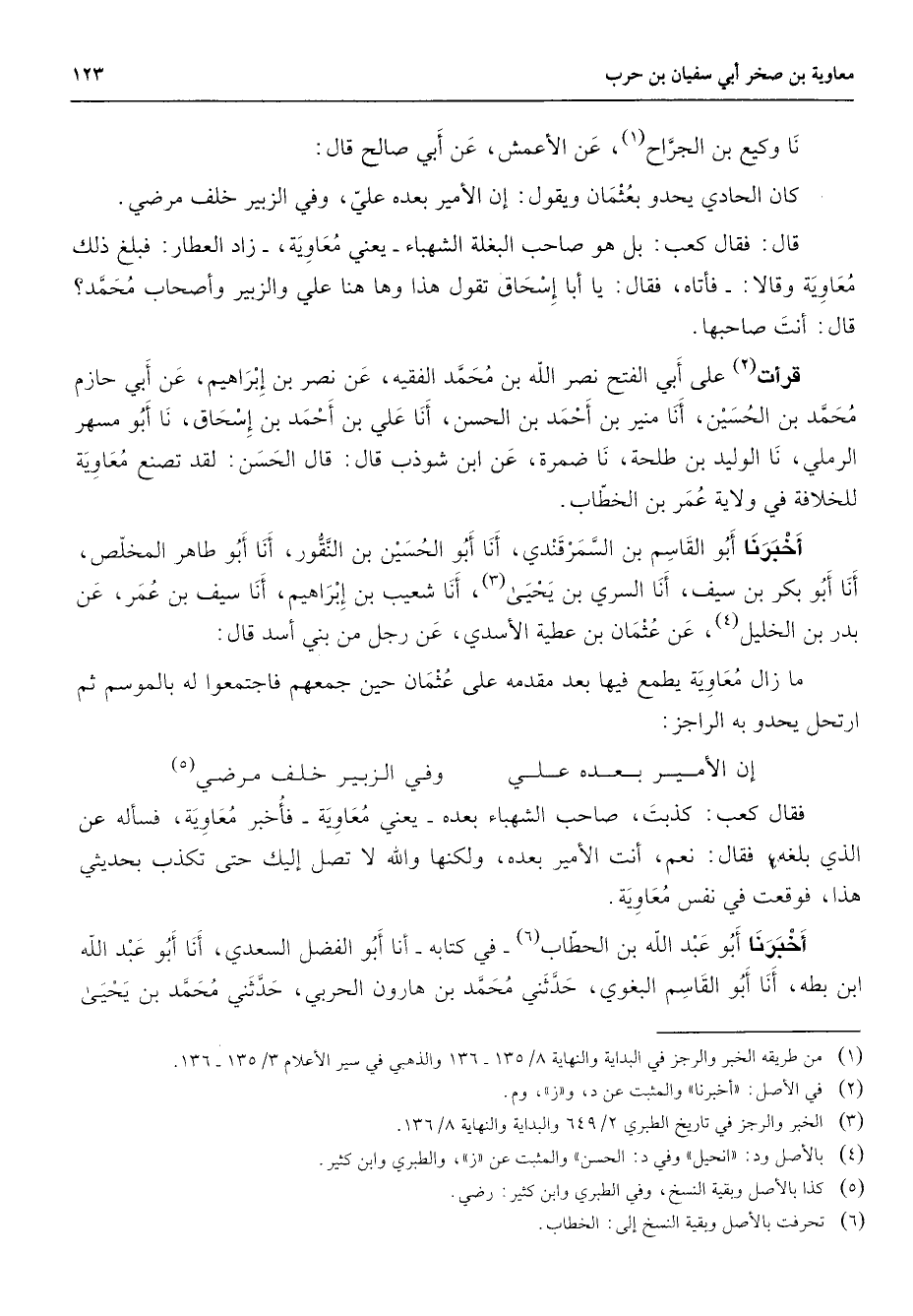 نا وكيع بن الجراح (1) عن الأعمش عن أبي صالح قال كان الحادي يحدو بعثمان ويقول إن الأمير بعده علي وفي الزبير خلف مرضي قال فقال كعب بل هو صاحب البغلة الشهباء يعني معاوية زاد العطار فبلغ ذلك معاوية وقالا فأتاه فقال يا أبا إسحاق تقول هذا وها هنا علي والزبير وأصحاب محمد قال أنت صاحبها قرأت (2) على أبي الفتح نصر الله بن محمد الفقيه عن نصر بن إبراهيم عن أبي حازم محمد بن الحسين أنا منير بن أحمد بن الحسن أنا علي بن أحمد بن إسحاق نا أبو مسهر الرملي نا الوليد بن طلحة نا ضمرة عن ابن شوذب قال قال الحسن لقد تصنع معاوية للخلافة في ولاية عمر بن الخطاب أخبرنا أبو القاسم بن السمرقندي أنا أبو الحسين بن النقور أنا أبو طاهر المخلص أنا أبو بكر بن سيف أنا السري بن يحيى (3) أنا شعيب بن إبراهيم أنا سيف بن عمر عن بدر بن الخليل (4) عن عثمان بن عطية الأسدي عن رجل من بني أسد قال ما زال معاوية يطمع فيها بعد مقدمه على عثمان حين جمعهم فاجتمعوا له بالموسم ثم ارتحل يحدو به الراجز إن الأمير بعده علي * وفي الزبير خلف مرضي * (5) فقال كعب كذبت صاحب الشهباء بعده يعني معاوية فأخبر معاوية فسأله عن الذي بلغه فقال نعم أنت الأمير بعده ولكنها الله لا تصل إليك حتى تكذب بحديثي هذا فوقعت في نفس معاوية أخبرنا أبو عبد الله بن الخطاب (6) في كتابه أنا أبو الفضل السعدي أنا أبو عبد الله ابن بطه أنا أبو القاسم البغوي حدثني محمد بن هارون الحربي حدثني محمد بن يحيى