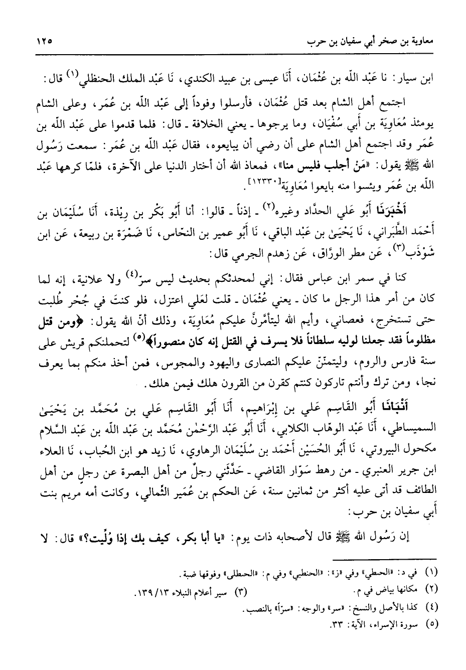 الشام يومئذ معاوية بن أبي سفيان وما يرجوها يعني الخلافة قال فلما قدموا على عبد الله بن عمر وقد اجتمع أهل الشام على أن رضي أن يبايعوه فقال عبد الله بن عمر سمعت رسول الله (صلى الله عليه وسلم) يقول من أجلب فليس منا فمعاذ الله أن أختار الدنيا على الآخرة فلما كرهها عبد الله بن عمر ويئسوا منه بايعوا معاوية أخبرنا أبو علي الحداد وغيره (2) إذنا قالوا أنا أبو بكر بن ريذة أنا سليمان بن أحمد الطبراني نا يحيى بن عبد الباقي نا أبو عمير بن النحاس نا ضمرة بن ربيعة عن ابن شوذب (3) عن مطر الوراق عن زهدم الجرمي قال كنا في سمر ابن عباس فقال إني لمحدثكم بحديث ليس سر (4) ولا علانية إنه لما كان من أمر هذا الرجل ما كان يعني عثمان قلت لعلي اعتزل فلو كنت في جحر طلبت حتى تستخرج فعصاني وأيم الله ليتأمرن عليكم معاوية وذلك أن الله يقول " ومن قتل مظلوما فقد جعلنا لوليه سلطانا فلا يسرف في القتل إنه كان منصورا (5) " لتحملنكم قريش على سنة فارس والروم وليتمنن عليكم النصارى واليهود والمجوس فمن أخذ منكم بما يعرف نجا ومن ترك وأنتم تاركون كنتم كقرن من القرون هلك فيمن هلك أنبأنا أبو القاسم علي بن إبراهيم أنا أبو القاسم علي بن محمد بن يحيى السميساطي أنا عبد الوهاب الكلابي أنا أبو عبد الرحمن محمد بن عبد الله بن عبد السلام مكحول البيروتي نا أبو الحسين أحمد بن سليمان الرهاوي نا زيد هو ابن الحباب نا العلاء ابن جرير العنبري من رهط سوار القاضي حدثني رجل من أهل البصرة عن رجل من أهل الطائف قد أتى عليه أكثر من ثمانين سنة عن الحكم بن عمير الثمالي وكانت أمه مريم بنت أبي سفيان بن حرب إن رسول الله (صلى الله عليه وسلم) قال لأصحابه ذات يوم يا أبا بكر كيف بك إذا وليت قال لا