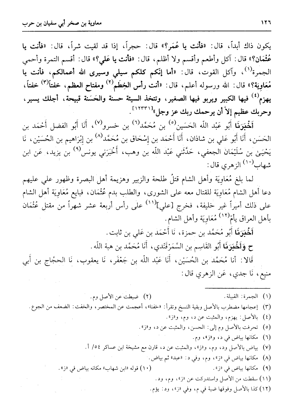 يكون ذاك أبدا قال فأنت يا عمر قال حجرا إذا قد لقيت شرا قال فأنت يا عثمان قال آكل وأطعم وأقسم ولا أظلم قال فأنت يا علي قال أقسم التمرة وأحمي الجمرة (1) وآكل القوت قال أما إنكم كلكم سيلي وسيرى الله أعمالكم فأنت يا معاوية قال الله ورسوله أعلم قال أنت رأس الخطم (2) ومفتاح العظم خفتا (3) خفتا يهزم (4) فيها الكبير ويربو فيها الصغير وتتخذ السيئة حسنة والحسنة قبيحة أجلك يسير وحربك عظيم إلا أن يرحمك ربك عز وجل أخبرنا أبو عبد الله الحسين (5) بن محمد (6) بن خسرو (7) أنا أبو الفضل أحمد بن الحسن أنا أبو علي بن شاذان أنا أحمد بن إسحاق بن محمد (8) بن إبراهيم بن الحسين نا يحيى بن سليمان الجعفي حدثني عبد الله بن وهب أخبرني يونس (9) بن يزيد عن ابن شهاب (10) الزهري قال لما بلغ معاوية وأهل الشام قتل طلحة والزبير وهزيمه أهل البصرة وظهور علي عليهم دعا أهل الشام معاوية للقتال معه على الشورى والطلب بدم عثمان فبايع معاوية أهل الشام على ذلك أميرا غير خليفة فخرج علي (11) على رأس أربعة عشر شهرا من مقتل عثمان بأهل العراق يأم (12) معاوية وأهل الشام أخبرنا أبو محمد بن حمزة نا أحمد بن علي بن ثابت ح وأخبرنا أبو القاسم بن السمرقندي أنا محمد بن هبة الله قالا أنا محمد بن الحسين أنا عبد الله بن جعفر نا يعقوب نا الحجاج بن أبي منيع نا جدي عن الزهري قال