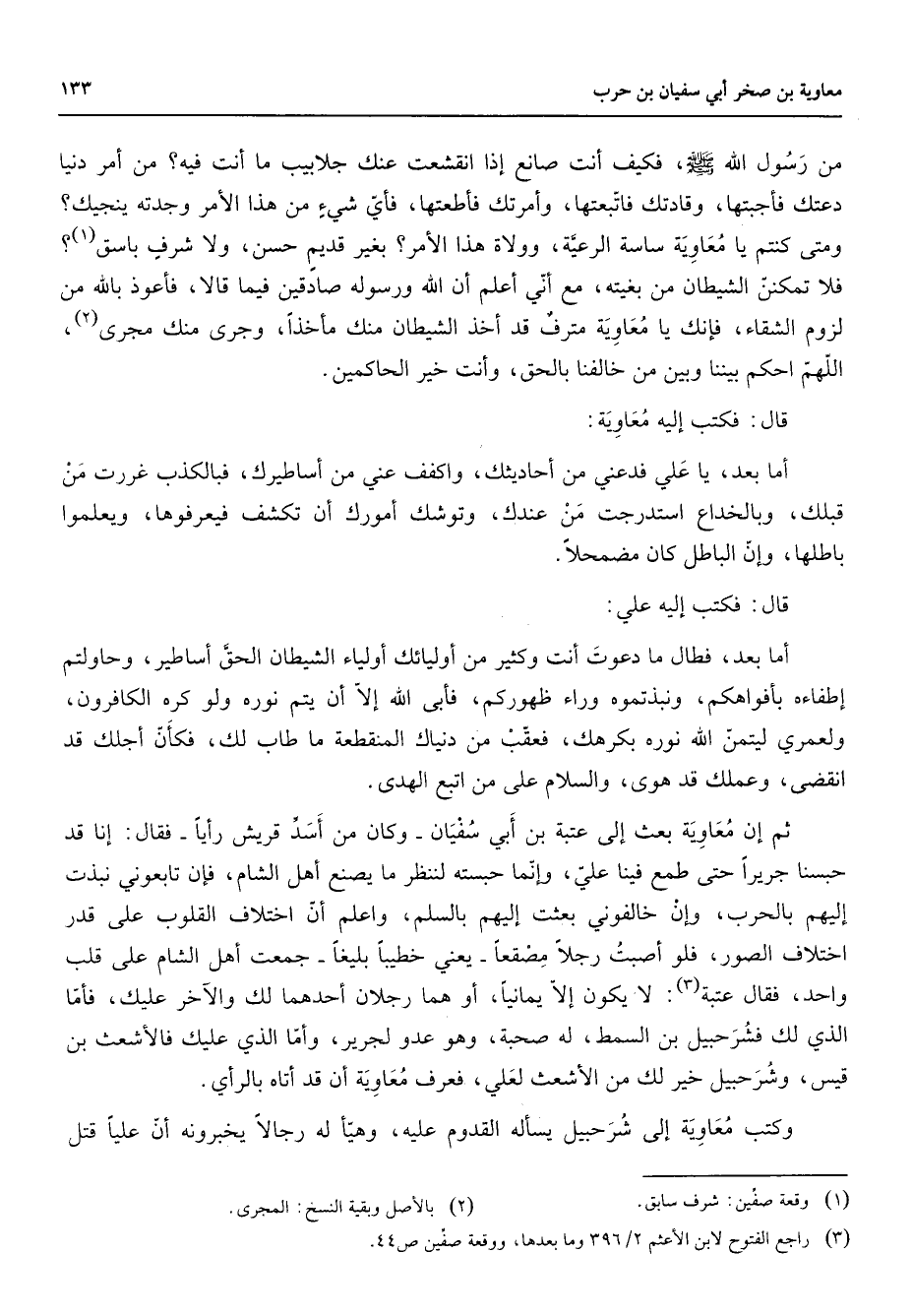(3) راجع الفتوح لابن الاعثم 2 / 396 وما بعدها ووقعة صفين ص 44