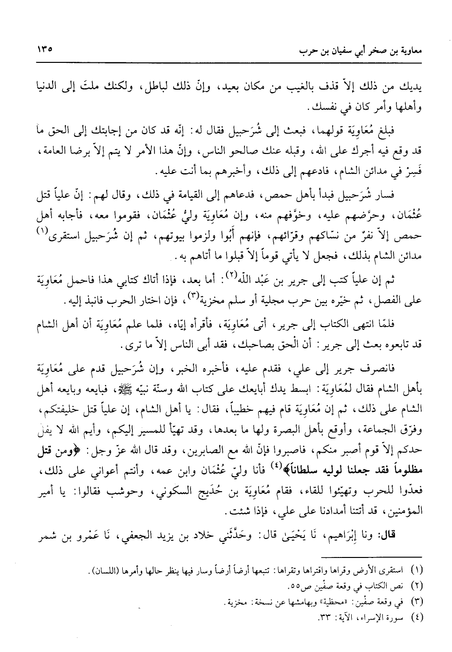 يديك من ذلك إلا قذف بالغيب من مكان بعيد وإن ذلك لباطل ولكنك ملت إلى الدنيا وأهلها وأمر كان في نفسك فبلغ معاوية قولهما فبعث إلى شرحبيل فقال له إنه قد كان من إجابتك إلى الحق ما قد وقع فيه أجرك على الله وقبله عنك صالحو الناس وإن هذا الأمر لا يتم إلا برضا العامة فسر في مدائن الشام فادعهم إلى ذلك وأخبرهم بما أنت عليه فسار شرحبيل فبدأ بأهل حمص فدعاهم إلى القيامة في ذلك وقال لهم إن عليا قتل عثمان وحرضهم عليه وخوفهم منه وإن معاوية ولي عثمان فقوموا معه فأجابه أهل حمص إلا نفر من نساكهم وقرائهم فإنه أبوا ولزموا بيوتهم ثم إن شرحبيل استقرى (1) مدائن الشام بذلك فجعل لا يأتي قوما إلا قبلوا ما أتاهم به ثم إن عليا كتب إلى جرير بن عبد الله (2) أما بعد فإذا أتاك كتابي هذا فاحمل معاوية على الفصل ثم خيره بين حرب مجلية أو سلم مخزية (3) فإن اختار الحرب فانبذ إليه فلما انتهى الكتاب إلى جرير أتى معاوية فأقرأه إياه فلما علم معاوية أن أهل الشام قد تابعوه بعث إلى جرير أن الحق بصاحبك فقد أبى الناس إلا ما ترى فانصرف جرير إلى علي فقدم عليه فأخبره الخبر وإن شرحبيل قدم على معاوية بأهل الشام فقال لمعاوية ابسط يدك أبايعك على كتاب الله وسنة نبيه (صلى الله عليه وسلم) فبايعه وبايعه أهل الشام على ذلك ثم إن معاوية قام فيهم خطيبا فقال يا أهل الشام إن عليا قتل خليفتكم وفرق الجماعة وأوقع بأهل البصرة ولها ما بعدها وقد تهيأ للمسير إليكم وأيم الله لا يقل حدكم إلا قوم أصبر منكم فاصبروا فإن الله مع الصابرين وقد قال الله عز وجل " ومن قتل مظلوما فقد جعلنا لوليه سلطانا (4) " فأناولي عثمان وابن عمه وأنتم أعواني على ذلك فعدوا للحرب وتهيئوا للقاء فقام معاوية بن حديج السكوني وحوشب فقالوا يا أمير المؤمنين قد أتتنا أمدادنا على علي فإذا شئت قال ونا إبراهيم نا يحيى قال وحدثني خلاد بن يزيد الجعفي نا عمرو بن شمر