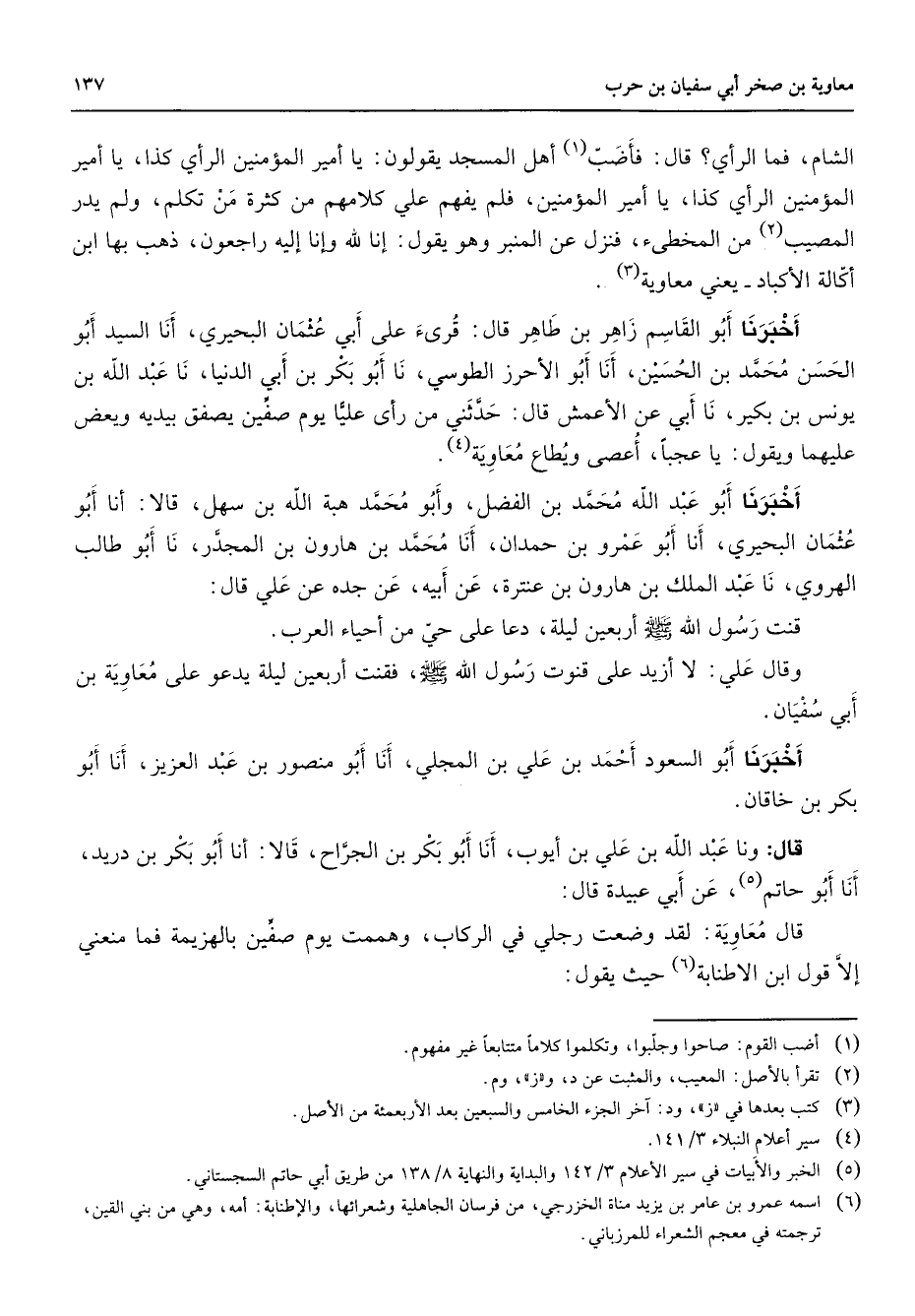 الشام فما الرأي قال فأضب (1) أهل المسجد يقولون يا أمير المؤمنين الرأي كذا يا أمير المؤمنين الرأي كذا يا أمير المؤمنين فلم يفهم علي كلامهم من كثرة من تكلم ولم يدر المصيب (2) من المخطئ فنزل عن المنبر وهو يقول إنا لله وإنا إليه راجعون ذهب بها ابن أكالة الأكباد يعني معاوية (3) أخبرنا أبو القاسم زاهر بن طاهر قال قرئ على أبي عثمان البحيري أنا السيد أبو الحسن محمد بن الحسين أنا أبو الأحرز الطوسي نا أبو بكر بن أبي الدنيا نا عبد الله بن يونس بن بكير نا أبي عن الأعمش قال حدثني من رأى عليا يوم صفين يصفق بيديه ويعض عليهما يقول يا عجبا أعصى ويطاع معاوية (4) أخبرنا أبو عبد الله محمد بن الفضل وأبو محمد هبة الله بن سهل قالا أنا أبو عثمان البحيري أنا أبو عمرو بن حمدان أنا محمد بن هارون بن المجدر نا أبو طالب الهروي نا عبد الملك بن هارون بن عنترة عن أبيه عن جده عن علي قال قنت رسول الله (صلى الله عليه وسلم) أربعين ليلة دعا على حي من أحياء العرب وقال علي لا أزيد على قنوت رسول الله (صلى الله عليه وسلم) فقنت أربعين ليلة يدعو على معاوية بن أبي سفيان أخبرنا أبو السعود أحمد بن علي بن المجلي أنا أبو منصور بن عبد العزيز أنا أبو بكر بن خاقان قال ونا عبد الله بن علي بن أيوب أنا أبو بكر بن الجراح قالا أنا أبو بكر بن دريد أنا أبو حاتم (5) عن أبي عبيدة قال قال معاوية لقد وضعت رجلي في الركاب وهممت يوم صفين بالهزيمة فما منعني إلا قول ابن الاطنابة (6) حيث يقول