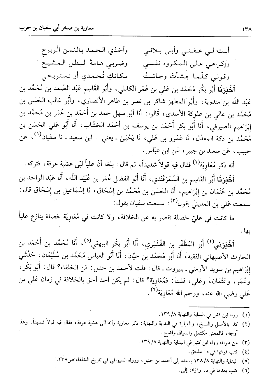 أبت لي عفتي وأبى بلائي * وأخذي الحمد بالثمن الربيح وإكراهي علي المكروه نفسي * وضربي هامة البطل المشيح وقولي كلما جشأت وجاشت * مكانك تحمدي أو تستريحي * أخبرنا أبو بكر محمد بن علي بن عمر الكابلي وأبو القاسم عبد الصمد بن محمد بن عبد الله بن مندوية وأبو المطهر شاكر بن نصر بن طاهر الأنصاري وأبو غالب الحسن بن محمد بن عالي بن علوكة الأسدي قالوا أنا أبو سهل حمد بن أحمد بن عمر بن محمد بن إبراهيم الصيرفي أنا أبو بكر أحمد بن يوسف بن أحمد الخشاب نا أبو علي الحسن بن محمد بن دكة المعدل نا عمرو بن علي نا يحيى يعني ابن سعيد نا سفيان (1) عن حبيب عن سعيد بن جبير عن ابن عباس أنه ذكر معاوية (2) فقال فيه قولا شديدا ثم قال بلغه أن عليا لبى عشية عرفة فتركه أخبرنا أبو القاسم بن السمرقندي أنا أبو الفضل عمر بن عبيد الله أنا عبد الواحد بن محمد بن عثمان بن إبراهيم أنا الحسن بن محمد بن إسحاق نا إسماعيل بن إسحاق قال سمعت علي بن المديني يقول (3) سمعت سفيان يقول ما كانت في علي خصلة تقصر به عن الخلافة ولا كانت في معاوية خصلة ينازع عليا بها أخبرني (4) أبو المظفر بن القشيري أنا أبو بكر البيهقي (5) أنا محمد بن أحمد بن الحارث الأصبهاني الفقيه أنا أبو محمد بن حيان أنا أبو العباس محمد بن سليمان حدثني إبراهيم بن سويد الأرمني ببيروت قال قلت لأحمد بن حنبل من الخلفاء قال أبو بكر وعمر وعثمان وعلي قلت فمعاوية قال لم يكن أحد أحق بالخلافة في زمان علي من علي Bهـ ورحم الله معاوية (6)