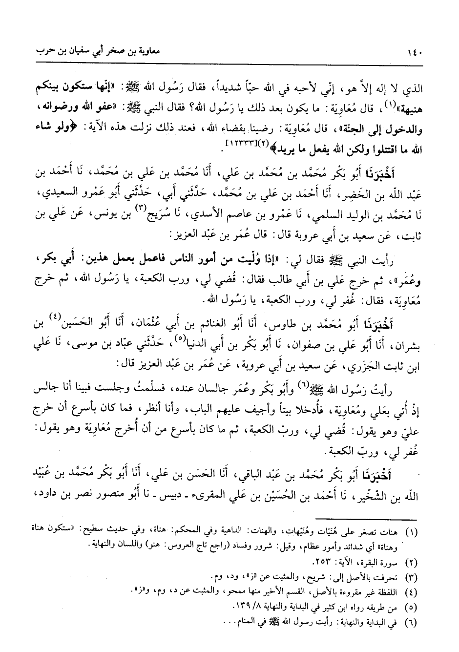 الذي لا إله إلا هو إني لأحبه في الله حبا شديدا فقال رسول الله (صلى الله عليه وسلم) إنها ستكون بينكم هنيهة (1) قال معاوية ما يكون بعد ذلك يا رسول الله فقال النبي (صلى الله عليه وسلم) عفو الله ورضوانه والدخول إلى الجنة قال معاوية رضينا بقضاء الله فعند ذلك نزلت هذه الآية " ولو شاء الله ما اقتتلوا ولكن الله يفعل ما يريد " (2) أخبرنا أبو بكر محمد بن محمد بن علي أنا محمد بن علي بن محمد نا أحمد بن عبد الله بن الخضر أنا أحمد بن علي بن محمد حدثني أبي حدثني أبو عمرو السعيدي نا محمد بن الوليد السلمي نا عمرو بن عاصم الأسدي نا سريج (3) بن يونس عن علي بن ثابت عن سعيد بن أبي عروبة قال قال عمر بن عبد العزيز رأيت النبي (صلى الله عليه وسلم) فقال لي إذا وليت من أمور الناس فاعمل بعمل هذين أبي بكر وعمر ثم خرج علي بن أبي طالب فقال قضي لي ورب الكعبة يا رسول الله ثم خرج معاوية فقال غفر لي ورب الكعبة يا رسول الله أخبرنا أبو محمد بن طاوس أنا أبو الغنائم بن أبي عثمان أنا أبو الحسين (4) بن بشران أنا أبو علي بن صفوان نا أبو بكر بن أبي الدنيا (5) حدثني عباد بن موسى نا علي ابن ثابت الجزري عن سعيد بن أبي عروبة عن عمر بن عبد العزيز قال رأيت رسول الله (6) وأبو بكر وعمر جالسان عنده فسلمت وجلست فبينا أنا جالس إذ أتي بعلي ومعاوية فأدخلا بيتا وأجيف عليهم الباب وأنا أنظر فما كان بأسرع أن خرج علي وهو يقول قضي لي ورب الكعبة ثم ما كان بأسرع من أن أخرج معاوية وهو يقول غفر لي ورب الكعبة أخبرنا أبو بكر محمد بن عبد الباقي أنا الحسن بن علي أنا أبو بكر محمد بن عبيد الله بن الشخير نا أحمد بن الحسين بن علي المقرئ دبيس نا أبو منصور نصر بن داود