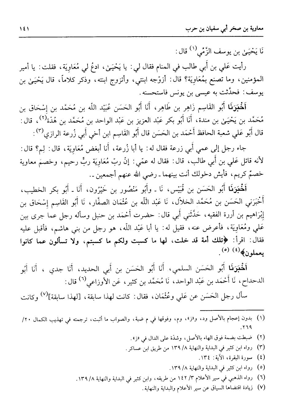 نا يحي بن يوسف الزمي (1) قال رأيت علي بن أبي طالب في المنام فقال لي يا يحيى ادع لي معاوية فقلت يا أمير المؤمنين وما تصنع بمعاوية قال أزوجه ابنتي وأتزوج ابنته وذكر كلاما قال يحيى بن يوسف فحدثت به عيسى بن يونس فاستحسنه أخبرنا أبو القاسم زاهر بن طاهر أنا أبو الحسن عبيد الله بن محمد بن إسحاق بن محمد بن يحيى بن مندة أنا أبو بكر عبد العزيز بن عبد الواحد بن محمد بن هدة (2) قال قال أبو علي شعبة الحافظ أحمد بن الحسن قال أبو القاسم ابن أخي أبي زرعة الرازي (3) جاء رجل إلى عمي أبي زرعة فقال له يا أبا زرعة أنا أبغض معاوية قال لم قال لأنه قاتل علي بن أبي طالب قال فقال له عمي إن رب معاوية رب رحيم وخصم معاوية خصم كريم فأيش دخولك أنت بينهما Bهم أجمعين أخبرنا أبو الحسن بن قبيس نا وأبو منصور بن خيرون أنا أبو بكر الخطيب أخبرني الحسن بن محمد الخلال نا عبد الله بن عثمان الصفار نا أبو القاسم إسحاق بن إبراهيم بن أررة الفقيه حدثني أبي قال حضرت أحمد بن حنبل وسأله رجل عما جرى بين علي ومعاوية فأعرض عنه فقيل له يا أبا عبد الله هو رجل من بني هاشم فأقبل عليه فقال اقرأ " تلك أمة قد خلت لها ما كسبت ولكم ما كسبتم ولا تسألون عما كانوا يعملون (4) (5) " أخبرنا أبو الحسن السلمي أنا أبو الحسن بن أبي الحديد أنا جدي أنا أبو الدحداح نا أحمد بن عبد الواحد نا محمد بن كثير عن الأوزاعي (6) قال سأل رجل الحسن عن علي وعثمان فقال كانت لهذا سابقة لهذا سابقة (7) وكانت