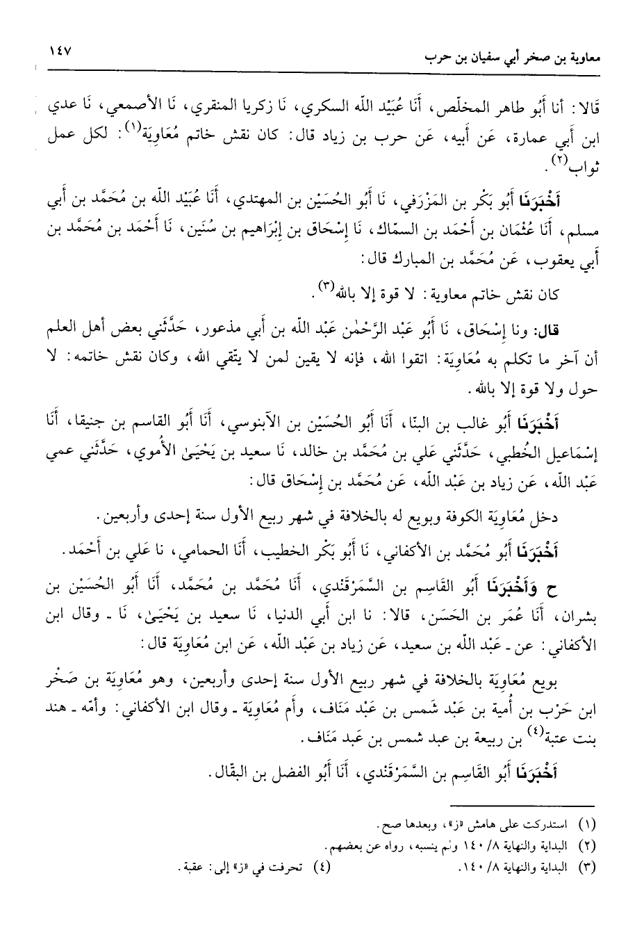 قالا أنا أبو طاهر المخلص أنا عبيد الله السكري نا زكريا المنقري نا الأصمعي نا عدي ابن أبي عمارة عن أبيه عن حرب بن زياد قال كان نقش خاتم معاوية (1) لكل عمل ثواب (2) أخبرنا أبو بكر بن المزرفي نا أبو الحسين بن المهتدي أنا عبيد الله بن محمد بن أبي مسلم أنا عثمان بن أحمد بن السماك نا إسحاق بن إبراهيم بن سنين نا أحمد بن محمد بن أبي يعقوب عن محمد بن المبارك قال كان نقش خاتم معاوية لا قوة إلا بالله (3) قال ونا إسحاق نا أبو عبد الرحمن عبد الله بن أبي مذعور حدثني بعض أهل العلم أن آخر ما تكلم به معاوية اتقوا الله فإن لا يقين لمن لا يتقي الله وكان نقش خاتمه لا حول ولا قوة إلا بالله أخبرنا أبو غالب بن البنا أنا أبو الحسين بن الآبنوسي أنا أبو القاسم بن جنيقا أنا إسماعيل الخطبي حدثني علي بن محمد بن خالد نا سعيد بن يحيى الأموي حدثني عمي عبد الله عن زياد بن عبد الله عن محمد بن إسحاق قال دخل معاوية الكوفة وبويع له بالخلافة في شهر ربيع الأول سنة إحدى وأربعين أخبرنا أبو محمد بن الأكفاني نا أبو بكر الخطيب أنا الحمامي نا علي بن أحمد ح وأخبرنا أبو القاسم بن السمرقندي أنا محمد بن محمد أنا أبو الحسين بن بشران أنا عمر بن الحسن قالا نا ابن أبي الدنيا نا سعيد بن يحيى نا وقال ابن الأكفاني عن عبد الله بن سعيد عن زياد بن عبد الله عن ابن معاوية قال بويع معاوية بالخلافة في شهر ربيع الأول سنة إحدى وأربعين وهو معاوية بن صخر ابن حرب بن أمية بن عبد شمس بن عبد مناف وأم معاوية وقال ابن الأكفاني وأمه هند بنت عتبة (4) بن ربيعة بن عبد شمس بن عبد مناف أخبرنا أبو القاسم بن السمرقندي أنا أبو الفضل بن البقال