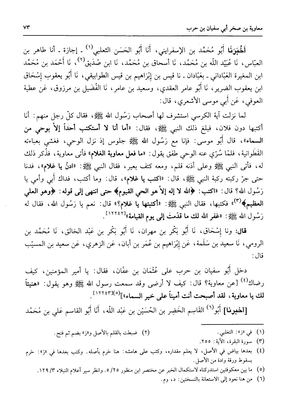 أخبرنا أبو محمد بن الإسفرايني أنا أبو الحسن الثعلبي (1) إجازة أنا طاهر بن العباس نا عبيد الله بن محمد نا أسحاق بن محمد نا ابن صديق (2) نا أحمد بن محمد ابن المغيرة العباداني بعبادان نا قيس بن إبراهيم بن قيس الطوابيقي نا أبو يعقوب إسحاق ابن يعقوب الضرير نا أبو عامر العقدي وسعيد بن عامر نا الفضيل بن مرزوق عن عطية العوفي عن أبي موسى الأشعري قال لما نزلت آية الكرسي استشرف لها أصحاب رسول الله (صلى الله عليه وسلم) فقال كل رجل منهم أنا أكتبها دون فلان فبلغ ذلك النبي (صلى الله عليه وسلم) فقال أما أنا لا أستكتب أحدا إلا بوحي من السماء قال أبو موسى فإنا مع رسول الله (صلى الله عليه وسلم) جلوس إذ نزل الوحي فغشي بعباءته القطوانية فلما سري عنه الوحي طفق يقول ما فعل معاوية الغلام فأتى معاوية فذكر ذلك له فأتى النبي (صلى الله عليه وسلم) وعلى أذنه قلم ومعه كتف بعير فقال النبي (صلى الله عليه وسلم) ادن يا غلام فدنا حتى جر ركبته ركبة النبي (صلى الله عليه وسلم) قال اكتب يا غلام قال وما أكتب فداك أبي وأمي يا رسول الله قال اكتب " الله لا إله إلا هو الحي القيوم " حتى انتهى إلى قوله " وهو العلي العظيم (3) " فكتبها فقال النبي (صلى الله عليه وسلم) أكتبتها يا غلام قال نعم يا رسول الله فقال له رسول الله (صلى الله عليه وسلم) غفر الله لك ما قدمت إلى يوم القيامة قال ونا إسحاق نا أبو بكر بن مهران نا أبو بكر بن عبد الخالق نا محمد بن الرومي نا سعيد بن سلمة عن إبراهيم بن عمر بن أبان عن الزهري عن سعيد بن المسيب قال دخل أبو سفيان بن حرب على عثمان بن عفان فقال يا أمير المؤمنين كيف رضاك (4) عن معاوية قال كيف لا أرضى وقد سمعت رسول الله (صلى الله عليه وسلم) وهو يقول هنيئا لك يا معاوية لقد أصبحت أنت أمينا على خير السماء (5) أخبرنا أبو (6) القاسم الخضر بن الحسين بن عبد الله أنا أبو القاسم علي بن محمد
