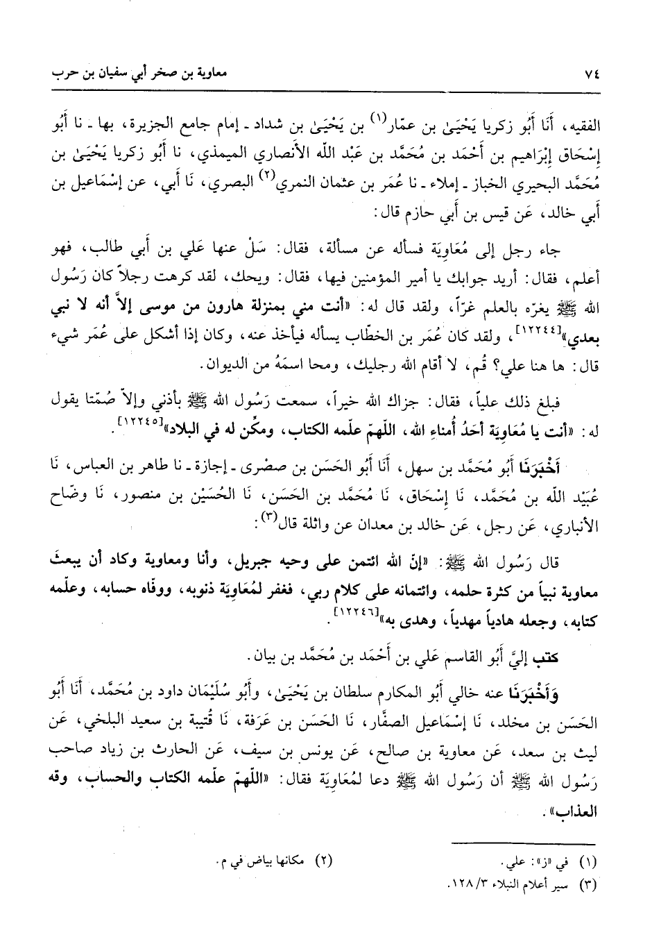 الفقيه أنا أبو زكريا يحيى بن عمار (1) بن يحيى بن شداد إمام جامع الجزيرة بها نا أبو إسحاق إبراهيم بن أحمد بن محمد بن عبد الله الأنصاري الميمذي نا أبو زكريا يحيى بن محمد البحيري الخباز إملاء نا عمر بن عثمان النمري (2) البصري نا أبي عن إسماعيل بن أبي خالد عن قيس بن أبي حازم قال جاء رجل إلى معاوية فسأله عن مسألة فقال سل عنها علي بن أبي طالب فهو أعلم فقال أريد جوابك يا أمير المؤمنين فيها فقال ويحك لقد كرهت رجلا كان رسول الله (صلى الله عليه وسلم) يغره بالعلم غرا ولقد قال له أنت مني بمنزلة هارون بن موسى إلا أنه لا نبي بعدي ولقد كان عمر بن الخطاب يسأله فيأخذ عنه وكان إذا أشكل على عمر شئ قال ها هنا علي قم لا أقام الله رجليك ومحا اسمه من الديوان فبلغ ذلك عليا فقال جزاك الله خيرا سمعت رسول الله (صلى الله عليه وسلم) بأذني وإلا صمتا يقول له أنت يا معاوية أحد أمناء الله اللهم علمه الكتاب ومكن له في البلاد أخبرنا أبو محمد بن سهل أنا أبو الحسن بن صصرى إجازة نا طاهر بن العباس نا عبيد الله بن محمد نا إسحاق نا محمد بن الحسن نا الحسين بن منصور نا وضاح الأنباري عن رجل عن خالد بن معدان عن واثلة قال (3) قال رسول الله (صلى الله عليه وسلم) إن الله ائتمن على وحيه جبريل وأنا ومعاوية وكاد أن يبعث معاوية نبيا من كثرة حلمه وائتمانه على كلام ربي فغفر لمعاوية ذنوبه ووفاه حسابه وعلمه كتابه وجعله هاديا مهديا وهدى به كتب إلي أبو القاسم علي بن أحمد بن محمد بن بيان وأخبرنا عنه خالي أبو المكارم سلطان بن يحيى وأبو سليمان داود بن محمد أنا أبو الحسن بن مخلد نا إسماعيل الصفار نا الحسن بن عرفة نا قتيبة بن سعيد البلخي عن ليث بن سعد عن معاوية بن صالح عن يونس بن سيف عن الحارث بن زياد صاحب رسول الله (صلى الله عليه وسلم) أن رسول الله (صلى الله عليه وسلم) دعا لمعاوية فقال اللهم علمه الكتاب والحساب وقه العذاب