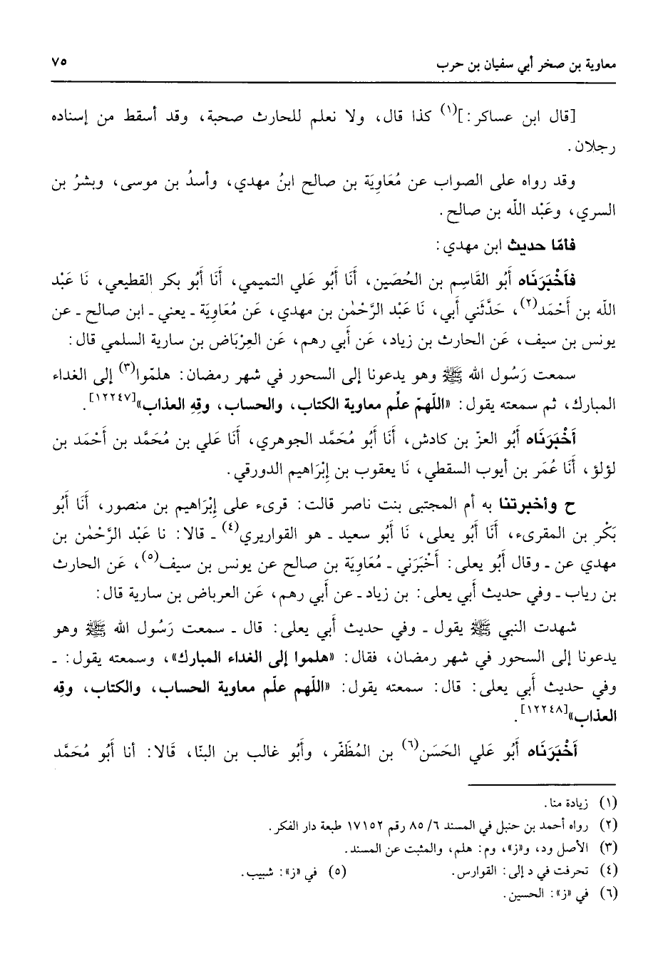 قال ابن عساكر (1) كذا قال ولا نعلم للحارث صحبة وقد أسقط من إسناده رجلان وقد رواه على الصواب عن معاوية بن صالح ابن مهدي وأسد بن موسى وبشر بن السري وعبد الله بن صالح فأما حديث ابن مهدي فأخبرناه أبو القاسم بن الحصين أنا أبو علي التميمي أنا أبو بكر القطيعي نا عبد الله بن أحمد (2) حدثني أبي نا عبد الرحمن بن مهدي عن معاوية يعني ابن صالح عن يونس بن سيف عن الحارث بن زياد عن أبي رهم عن العرباض بن سارية السلمي قال سمعت رسول الله (صلى الله عليه وسلم) وهو يدعونا إلى السحور في شهر رمضان هلموا (3) إلى الغداء المبارك ثم سمعته يقول اللهم علم معاوية الكتاب والحساب وقه العذاب أخبرناه أبو العز بن كادش أنا أبو محمد الجوهري أنا علي بن محمد بن أحمد بن لؤلؤ أنا عمر بن أيوب السقطي نا يعقوب بن إبراهيم الدورقي ح وأخبرتنا به أم المجتبى بنت ناصر قالت قرئ على إبراهيم بن منصور أنا أبو بكر بن المقرئ أنا أبو يعلى نا أبو سعيد هو القواريري (4) قالا نا عبد الرحمن بن مهدي عن وقال أبو يعلى أخبرني معاوية بن صالح عن يونس بن سيف (5) عن الحارث بن رياب وفي حديث أبي يعلى بن زياد عن أبي رهم عن العرباض بن سارية قال شهدت النبي (صلى الله عليه وسلم) يقول وفي حديث أبي يعلى قال سمعت رسول الله (صلى الله عليه وسلم) وهو يدعونا إلى السحور في شهر رمضان فقال هلموا إلى الغداء المبارك وسمعته يقول وفي حديث أبي يعلى قال سمعته يقول اللهم علم معاوية الحساب والكتاب وقه العذاب أخبرناه أبو علي الحسن (6) بن المظفر وأبو غالب بن البنا قالا أنا أبو محمد