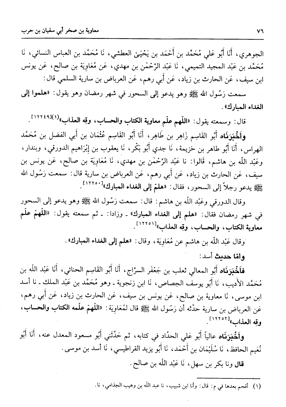 / الجوهري أنا أبو علي محمد بن أحمد بن يحيى العطشي نا محمد بن العباس النسائي نا محمد بن عبد المجيد التميمي نا عبد الرحمن بن مهدي عن معاوية بن صالح عن يونس ابن سيف عن الحارث بن زياد عن أبي رهم عن العرباض بن سارية السلمي قال سمعت رسول الله (صلى الله عليه وسلم) وهو يدعو إلى السحور في شهر رمضان وهو يقول هلموا إلى الغداء المبارك قال وسمعته يقول اللهم علم معاوية الكتاب والحساب وقه العذاب (1) وأخبرناه أبو القاسم زاهر بن طاهر أنا أبو القاسم عثمان بن أبي الفضل بن محمد الهراس أنا أبو طاهر بن خزيمة نا جدي أبو بكر نا يعقوب بن إبراهيم الدورقي وبندار وعبد الله بن هاشم قالوا نا عبد الرحمن بن مهدي نا معاوية بن صالح عن يونس بن سيف عن الحارث بن زياد عن أبي رهم عن العرباض بن سارية قال سمعت رسول الله (صلى الله عليه وسلم) يدعو رجلا إلى السحور فقال هلم إلى الغداء المبارك وقال الدورقي وعبد الله بن هاشم قال سمعت رسول الله (صلى الله عليه وسلم) وهو يدعو إلى السحور في شهر رمضان فقال هلم إلى الغداء المبارك وزادا ثم سمعته يقول اللهم علم معاوية الكتاب والحساب وقه العذاب وقال عبد الله بن هاشم عن معاوية وقال هلم إلى الغداء المبارك وأما حديث أسد فأخبرناه أبو المعالي ثعلب بن جعفر السراج أنا أبو القاسم الحنائي أنا عبد الله بن محمد الأديب نا أبو يوسف الجصاص نا ابن زنجوية وهو محمد بن عبد الملك نا أسد ابن موسى نا معاوية بن صالح عن يونس بن سيف عن الحارث بن زياد عن أبي رهم عن العرباض بن سارية حدثه أن رسول الله (صلى الله عليه وسلم) قال لمعاوية اللهم علمه الكتاب والحساب وقه العذاب وأخبرناه عاليا أبو علي الحداد في كتابه ثم حدثني أبو مسعود المعدل عنه أنا أبو نعيم الحافظ نا سليمان بن أحمد نا أبو يزيد القراطيسي نا أسد بن موسى قال ونا بكر بن سهل نا عبد الله بن صالح