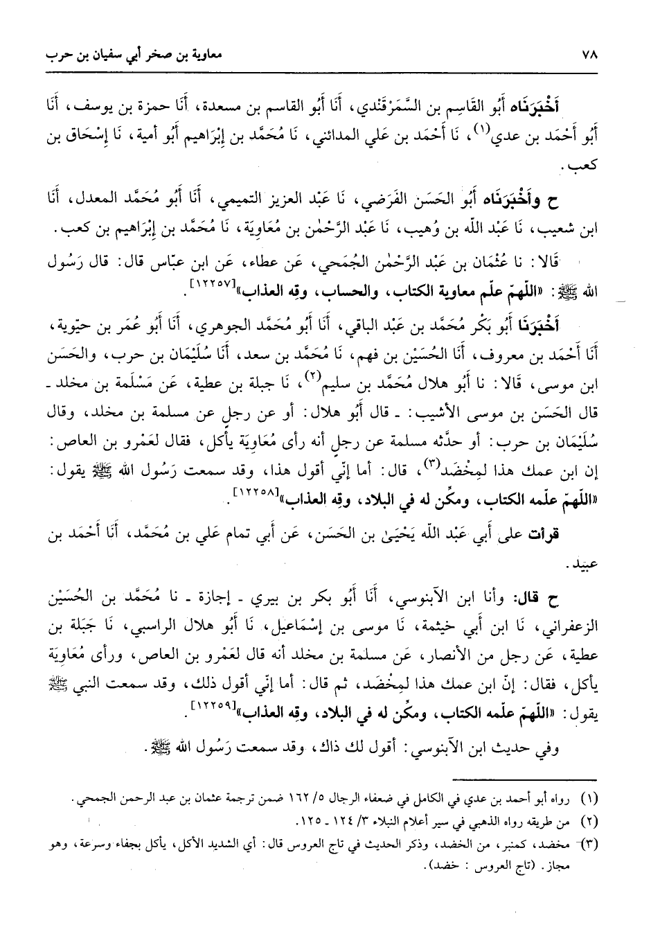 أخبرناه أبو القاسم بن السمرقندي أنا أبو القاسم بن مسعدة أنا حمزة بن يوسف أنا أبو أحمد بن عدي (1) نا أحمد بن علي المدائني نا محمد بن إبراهيم أبو أمية نا إسحاق بن كعب ح وأخبرناه أبو الحسن الفرضي نا عبد العزيز التميمي أنا أبو محمد المعدل أنا ابن شعيب نا عبد الله بن وهيب نا عبد الرحمن بن معاوية نا محمد بن إبراهيم بن كعب قالا نا عثمان بن عبد الرحمن الجمحي عن عطاء عن ابن عباس قال قال رسول الله (صلى الله عليه وسلم) اللهم علم معاوية الكتاب والحساب وقه العذاب أخبرنا أبو بكر محمد بن عبد الباقي أنا أبو محمد الجوهري أنا أبو عمر بن حيوية أنا أحمد بن معروف أنا الحسين بن فهم نا محمد بن سعد أنا سليمان بن حرب والحسن ابن موسى قالا نا أبو هلال محمد بن سليم (2) نا جبلة بن عطية عن مسلمة بن مخلد قال الحسن بن موسى الأشيب قال أبو هلال أو عن رجل عن مسلمة بن مخلد وقال سليمان بن حرب أو حدثه مسلمة عن رجل أنه رأى معاوية يأكل فقال لعمرو بن العاص إن ابن عمك هذا لمخضد (3) قال أما إني أقول هذا وقد سمعت رسول الله (صلى الله عليه وسلم) يقول اللهم علمه الكتاب ومكن له في البلاد وقه العذاب قرأت على أبي عبد الله يحيى بن الحسن عن أبي تمام علي بن محمد أنا أحمد بن عبيد ح قال وأنا ابن الآبنوسي أنا أبو بكر بن بيري إجازة نا محمد بن الحسين الزعفراني نا ابن أبي خيثمة نا موسى بن إسماعيل نا أبو هلال الراسبي نا جبلة بن عطية عن رجل من الأنصار عن مسلمة بن مخلد أنه قال لعمرو بن العاص ورأى معاوية يأكل فقال إن ابن عمك هذا لمخضد ثم قال أما إني أقول ذلك وقد سمعت النبي (صلى الله عليه وسلم) يقول اللهم علمه الكتاب ومكن له في البلاد وقه العذاب وفي حديث ابن الآبنوسي أقول لك ذاك وقد سمعت رسول الله (صلى الله عليه وسلم)