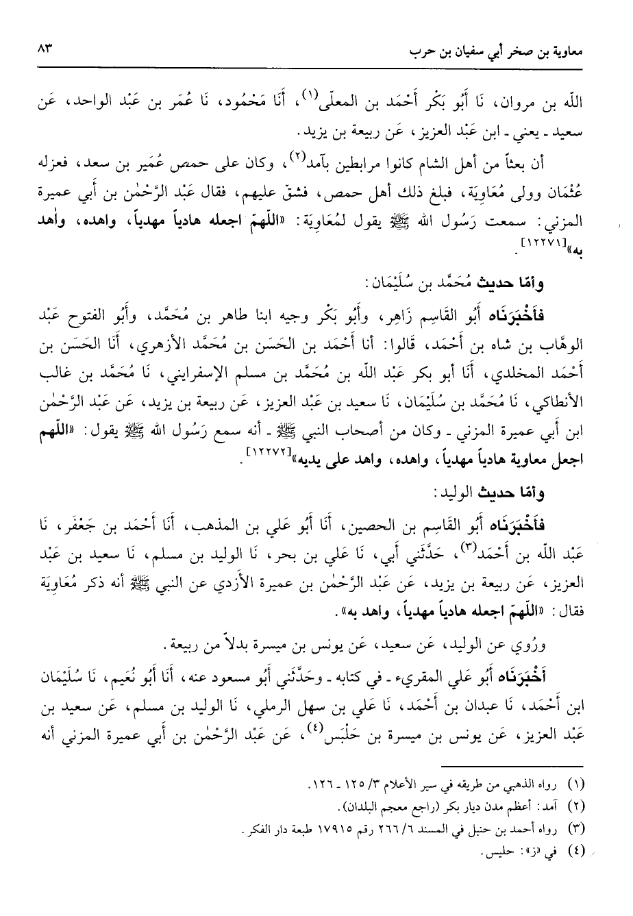 الله بن مروان نا أبو بكر أحمد بن المعلى (1) أنا محمود نا عمر بن عبد الواحد عن سعيد يعني ابن عبد العزيز عن ربيعة بن يزيد أن بعثا من أهل الشام كانوا مرابطين بآمد (2) وكان على حمص عمير بن سعد فعزله عثمان وولى معاوية فبلغ ذلك أهل حمص فشق عليهم فقال عبد الرحمن بن أبي عميرة المزني سمعت رسول الله (صلى الله عليه وسلم) يقول لمعاوية اللهم اجعله هاديا مهديا واهده واهد به وأما حديث محمد بن سليمان فأخبرناه أبو القاسم زاهر وأبو بكر وجيه ابنا طاهر بن محمد وأبو الفتوح عبد الوهاب بن شاه بن أحمد قالوا أنا أحمد بن الحسن بن محمد الأزهري أنا الحسن بن أحمد المخلدي نا أبو بكر عبد الله بن محمد بن مسلم الإسفرايني نا محمد بن غالب الأنطاكي نا محمد بن سليمان نا سعيد بن عبد العزيز عن ربيعة بن يزيد عن عبد الرحمن ابن أبي عميرة المزني وكان من أصحاب النبي (صلى الله عليه وسلم) أنه سمع رسول الله (صلى الله عليه وسلم) يقول اللهم اجعل معاوية هاديا مهديا واهده واهد على يديه وأما حديث الوليد فأخبرناه أبو القاسم بن الحصين أنا أبو علي بن المذهب أنا أحمد بن جعفر نا عبد الله بن أحمد (3) حدثني أبي نا علي بن بحر نا الوليد بن مسلم نا سعيد بن عبد العزيز عن ربيعة بن يزيد عن عبد الرحمن بن عميرة الأزدي عن النبي (صلى الله عليه وسلم) أنه ذكر معاوية فقال اللهم اجعله هاديا مهديا واهد به وروي عن الوليد عن سعيد عن يونس بن ميسرة بدلا من ربيعة أخبرناه أبو علي المقرئ في كتابه وحدثني أبو مسعود عنه أنا أبو نعيم نا سليمان ابن أحمد نا عبدان بن أحمد نا علي بن سهل الرملي نا الوليد بن مسلم عن سعيد بن عبد العزيز عن يونس بن ميسرة بن حلبس (4) عن عبد الرحمن بن أبي عميرة المزني أنه