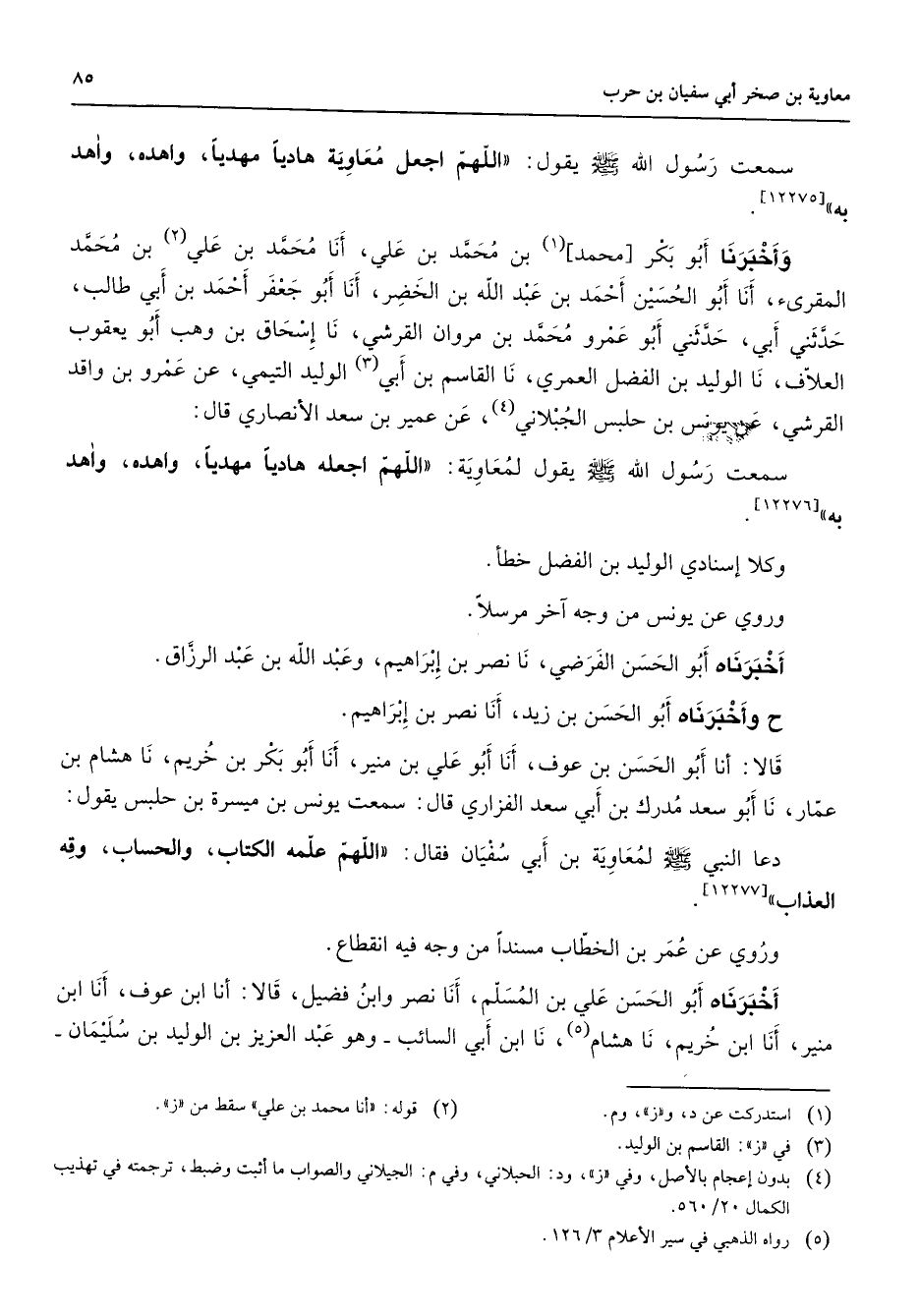 سمعت رسول الله (صلى الله عليه وسلم) يقول اللهم اجعل معاوية هاديا مهديا واهده واهد به وأخبرنا أبو بكر محمد (1) بن محمد بن علي أنا محمد بن علي (2) بن محمد المقرئ أنا أبو الحسين أحمد بن عبد الله بن الخضر أنا أبو جعفر أحمد بن أبي طالب حدثني أبي حدثني أبو عمرو محمد بن مروان القرشي نا إسحاق بن وهب أبو يعقوب العلاف نا الوليد بن الفضل العمري نا القاسم بن أبي (3) الوليد التيمي عن عمرو بن واقد القرشي عن يونس بن حلبس الجبلاني (4) عن عمير بن سعد الأنصاري قال سمعت رسول الله (صلى الله عليه وسلم) يقول لمعاوية اللهم اجعله هاديا مهديا واهده واهد به وكلا إسنادي الوليد بن الفضل خطأ وروي عن يونس من وجه آخر مرسلا أخبرناه أبو الحسن الفرضي نا نصر بن إبراهيم وعبد الله بن عبد الرزاق ح وأخبرناه أبو الحسن بن زيد أنا نصر بن إبراهيم قالا أنا أبو الحسن بن عوف أنا أبو علي بن منير أنا أبو بكر بن خريم نا هشام بن عمار نا أبو سعد مدرك بن أبي سعد الفزاري قال سمعت يونس بن ميسرة بن حلبس يقول دعا النبي (صلى الله عليه وسلم) لمعاوية بن أبي سفيان فقال اللهم علمه الكتاب والحساب وقه العذاب وروي عن عمر بن الخطاب مسندا من وجه فيه انقطاع أخبرناه أبو الحسن علي بن المسلم أنا نصر وابن فضيل قالا أنا ابن عوف أنا ابن منير أنا ابن خريم نا هشام (5) نا ابن أبي السائب وهو عبد العزيز بن الوليد بن سليمان