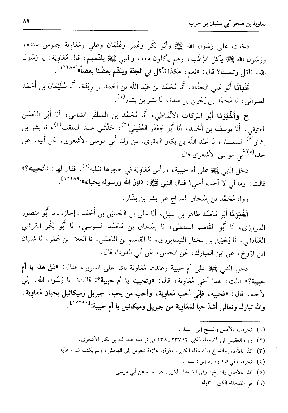 دخلت على رسول الله (صلى الله عليه وسلم) وأبو بكر وعمر وعثمان وعلي ومعاوية جلوس عنده ورسول الله (صلى الله عليه وسلم) يأكل الرطب وهم يأكلون معه والنبي (صلى الله عليه وسلم) يلقمهم قال معاوية يا رسول الله نأكل وتلقمنا قال نعم هكذا نأكل في الجنة ويلقم بعضنا بعضا أنبأنا أبو علي الحداد أنا محمد بن عبد الله بن أحمد بن ريذة أنا سليمان بن أحمد الطبراني نا محمد بن يحيى بن مندة نا بشر بن بشار (1) ح وأخبرنا أبو البركات الأنماطي أنا محمد بن المظفر الشامي أنا أبو الحسن العتيقي أنا يوسف بن أحمد أنا أبو جعفر العقيلي (2) حدثني عبيد الملقب (3) نا بشر بن بشار (4) السمسار نا عبد الله بن بكار المقرئ من ولد أبي موسى الأشعري عن أبيه عن جده (5) أبي موسى الأشعري قال دخل النبي (صلى الله عليه وسلم) على أم حبيبة ورأس معاوية في حجرها تفليه (6) فقال لها أتحبينه قالت وما لي لا أحب أخي فقال النبي (صلى الله عليه وسلم) فإن الله ورسوله يحبانه رواه محمد بن إسحاق السراج عن بشر بن بشار أخبرنا أبو محمد طاهر بن سهل أنا علي بن الحسين بن أحمد إجازة نا أبو منصور المروزي نا أبو القاسم السقطي نا إسحاق بن محمد السوسي نا أبو بكر القرشي العباداني نا يحيى بن مختار النيسابوري نا القاسم بن الحسن نا العلاء بن عمر نا شيبان ابن فروخ عن ابن المبارك عن الحسن عن أبي الدرداء قال دخل النبي (صلى الله عليه وسلم) على أم حبيبة وعندها معاوية نائم على السرير فقال من هذا يا أم حبيبة قالت هذا أخي معاوية قال وتحبينه يا أم حبيبة قالت يا رسول الله إني لأحبه قال فحبيه فإني أحب معاوية وأحب من يحبه جبريل وميكائيل يحبان معاوية والله تبارك وتعالى أشد حبا لمعاوية من جبريل وميكائيل يا أم حبيبة