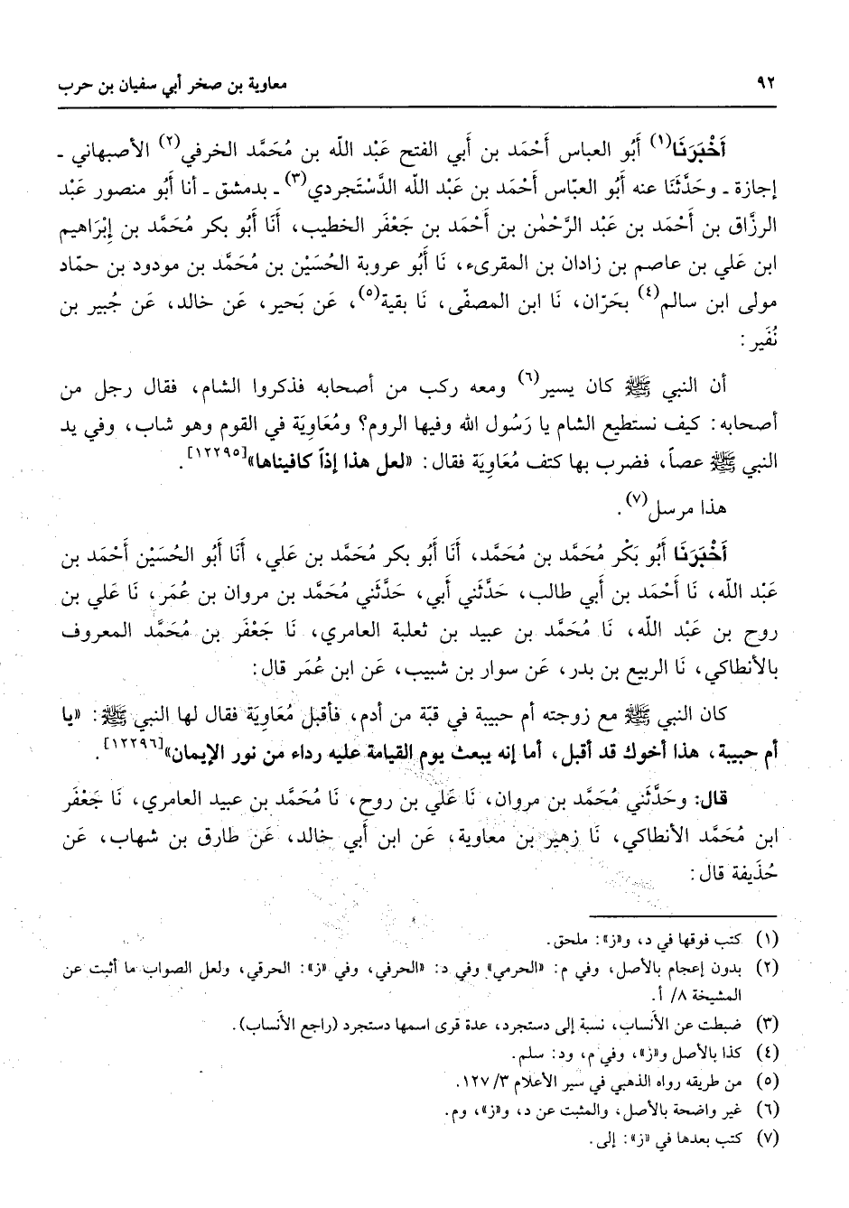 أخبرنا (1) أبو العباس أحمد بن أبي الفتح عبد الله بن محمد الخرفي (2) الأصبهاني إجازة وحدثنا عنه أبو العباس أحمد بن عبد الله الدستجردي (3) بدمشق أنا أبو منصور عبد الرزاق بن أحمد بن عبد الرحمن بن أحمد بن جعفر الخطيب أنا أبو بكر محمد بن إبراهيم ابن علي بن عاصم بن زادان بن المقرئ نا أبو عروبة الحسين بن محمد بن مودود بن حماد مولى ابن سالم (4) بحران نا ابن المصفى نا بقية (5) عن بحير عن خالد عن جبير بن نفير أن النبي (صلى الله عليه وسلم) كان يسير (6) ومعه ركب من أصحابه فذكروا الشام فقال رجل من أصحابه كيف نستطيع الشام يا رسول الله وفيها الروم ومعاوية في القوم وهو شاب وفي يد النبي (صلى الله عليه وسلم) عصا فضرب بها كتف معاوية فقال لعل هذا إذا كافيناها هذا مرسل (7) أخبرنا أبو بكر محمد بن محمد أنا أبو بكر محمد بن علي أنا أبو الحسين أحمد بن عبد الله نا أحمد بن أبي طالب حدثني أبي حدثني محمد بن مروان بن عمر نا علي بن روح بن عبد الله نا محمد بن عبيد بن ثعلبة العامري نا جعفر بن محمد المعروف بالأنطاكي نا الربيع بن بدر عن سوار بن شبيب عن ابن عمر قال كان النبي (صلى الله عليه وسلم) مع زوجته أم حبيبة في قبة من أدم فأقبل معاوية فقال لها النبي (صلى الله عليه وسلم) يا أم حبيبة هذا أخوك قد أقبل أما إنه يبعث يوم القيامة عليه رداء من نور الإيمان قال وحدثني محمد بن مروان نا علي بن روح نا محمد بن عبيد العامري نا جعفر ابن محمد الأنطاكي نا زهير بن معاوية عن ابن أبي خالد عن طارق بن شهاب عن حذيفة قال