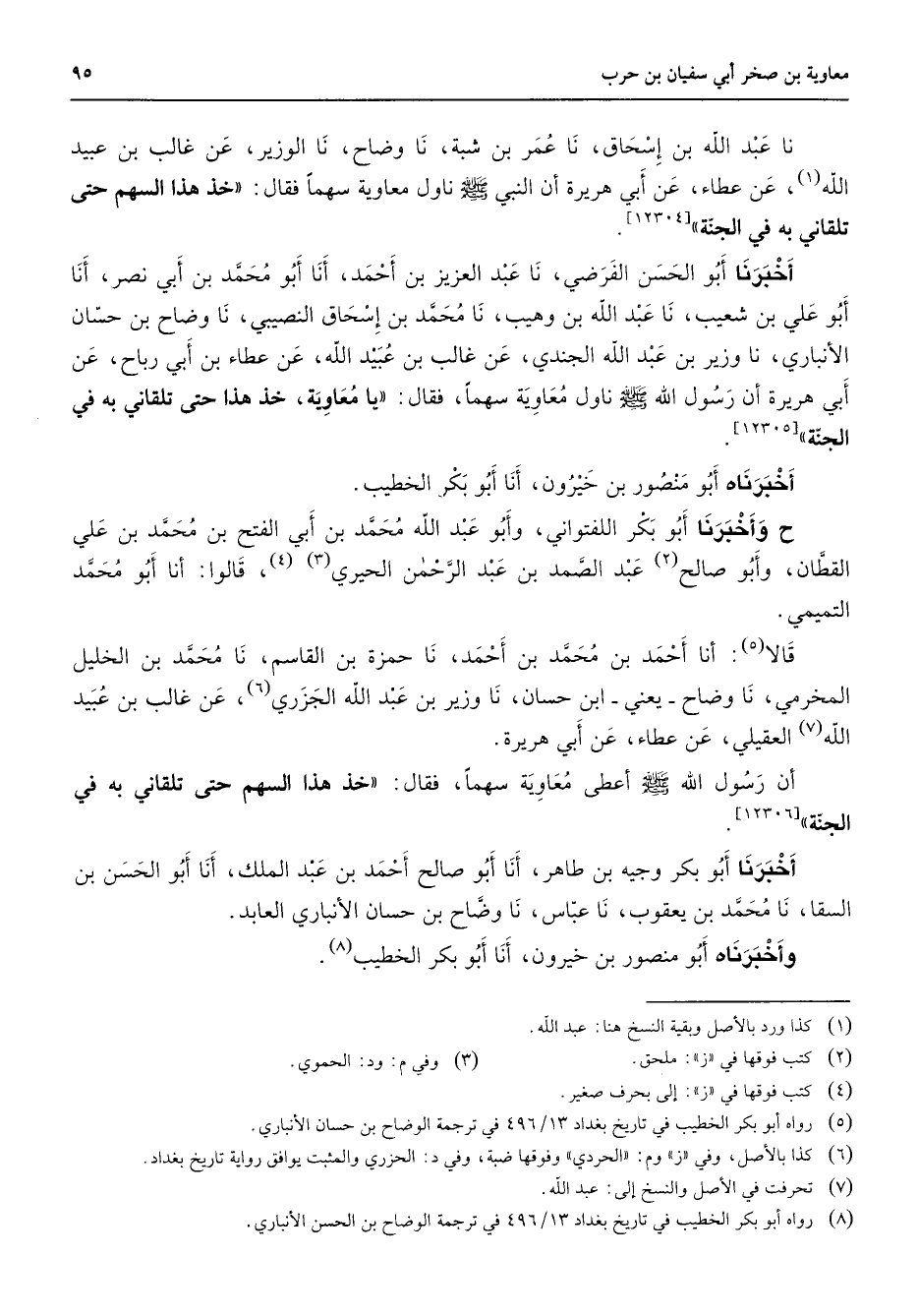نا عبد الله بن إسحاق نا عمر بن شبة نا وضاح نا الوزير عن غالب بن عبيد الله (1) عن عطاء عن أبي هريرة أن النبي (صلى الله عليه وسلم) ناول معاوية سهما فقال خذ هذا السهم حتى تلقاني به في الجنة أخبرنا أبو الحسن الفرضي نا عبد العزيز بن أحمد أنا أبو محمد بن أبي نصر أنا أبو علي بن شعيب نا عبد الله بن وهيب نا محمد بن إسحاق النصيبي نا وضاح بن حسان الأنباري نا وزير بن عبد الله الجندي عن غالب بن عبيد الله عن عطاء بن أبي رباح عن أبي هريرة أن رسول الله (صلى الله عليه وسلم) ناول معاوية سهما فقال يا معاوية خذ هذا حتى تلقاني به في الجنة أخبرناه أبو منصور بن خيرون أنا أبو بكر الخطيب ح وأخبرنا أبو بكر اللفتواني وأبو عبد الله محمد بن أبي الفتح بن محمد بن علي القطان وأبو صالح (2) عبد الصمد بن عبد الرحمن الحيري (3) (4) قالوا أنا أبو محمد التميمي قالا (5) أنا أحمد بن محمد بن أحمد نا حمزة بن القاسم نا محمد بن الخليل المخرمي نا وضاح يعني ابن حسان نا وزير بن عبد الله الجزري (6) عن غالب بن عبيد الله (7) العقيلي عن عطاء عن أبي هريرة أن رسول الله (صلى الله عليه وسلم) أعطى معاوية سهما فقال خذ هذا السهم حتى تلقاني به في الجنة أخبرنا أبو بكر وجيه بن طاهر أنا أبو صالح أحمد بن عبد الملك أنا أبو الحسن بن السقا نا محمد بن يعقوب نا عباس نا وضاح بن حسان الأنباري العابد وأخبرناه أبو منصور بن خيرون أنا أبو بكر الخطيب (8)