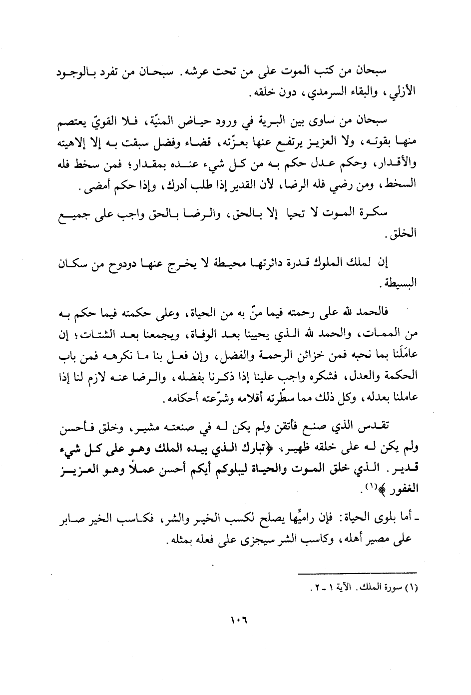 سُبْحَانَ من كتب الْمَوْت على من تَحت عَرْشه سبحانة من تفرد بالوجود الأزلي والبقاء السرمدي دون خلقه سُبْحَانَ من سَاوَى بَين الْبَريَّة فِي وُرُود حِيَاض الْمنية فَلَا الْقوي يعتصم مِنْهَا بقوته وَلَا الْعَزِيز يرْتَفع عَنْهَا بعزته قَضَاء وَفضل سبقت بِهِ إِلَّا إلاهيته والأقدار وَحكم عدل حكم بِهِ من كل شَيْء عِنْده بِمِقْدَار فَمن سخط فَلهُ السخط وَمن رَضِي فَلهُ الرِّضَا لِأَن الْقَدِير إِذا طلب أدْرك وَإِذا حكم أمضى سكرة الْمَوْت لَا تحيا إِلَّا بِالْحَقِّ وَالرِّضَا بِالْحَقِّ وَاجِب على جَمِيع الْخلق إِن لملك الْمُلُوك قدرَة دائرتها مُحِيطَة لَا يخرج عَنْهَا دودوح من سكان البسيطة فَالْحَمْد لله على رَحمته فِيمَا من بِهِ من الْحَيَاة وعَلى حكمته فِيمَا حكم بِهِ من الْمَمَات وَالْحَمْد لله الَّذِي يحيينا بعد الْوَفَاة ويجمعنا بعد الشتات إِن عاملنا بِمَا نحبه فَمن خَزَائِن الرَّحْمَة وَالْفضل وَإِن فعل بِنَا مَا نكرهه فَمن بَاب الْحِكْمَة وَالْعدْل فشكره وَاجِب علينا إِذا ذكرنَا بفضله وَالرِّضَا عَنهُ لَازم لنا إِذا عاملنا بعدله وكل ذَلِك مِمَّا سطرته أقلامه وشرعته أَحْكَامه تقدس الَّذِي صنع فأتقن وَلم يكن لَهُ فِي صَنعته مشير وَخلق فَأحْسن وَلم يكن لَهُ على خلقه ظهير تبَارك الَّذِي بِيَدِهِ الْملك وَهُوَ على كل شَيْء قدير الَّذِي خلق الْمَوْت والحياة ليَبْلُوكُمْ أَيّكُم أحسن عملا وهوالعزيز الغفور أما بلوى الْحَيَاة فَإِن راميها يصلح لكسب الْخَيْر وَالشَّر فكاسب الْخَيْر صابر على مصير أَهله وكاسب الشَّرّ سيجزى على فعله بِمثلِهِ