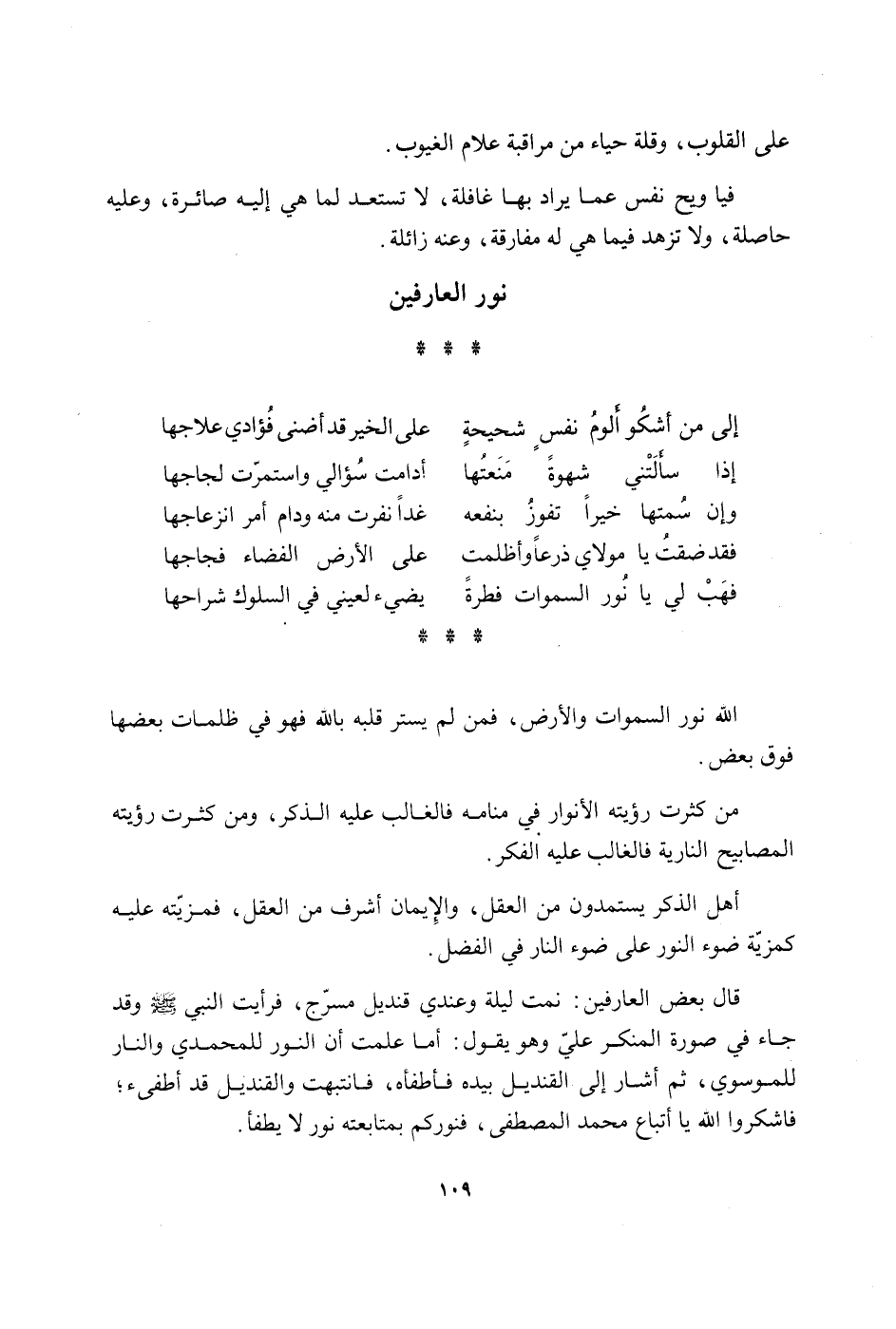 إِلَى من أَشْكُو ألوم نفس شحيحة على الخيرقد أضنى فُؤَادِي علاجها إِذا سَأَلتنِي شَهْوَة منعتها أدامت سُؤَالِي واستمرت لجاجها وَإِن سمتها خيرا تفوز بنفعه غَدا نفرت مِنْهُ ودام أَمر انزعاجها فقد ضقت يَا مولَايَ ذرعا وأظلمت على الأَرْض الفضاء فجاجها فَهَب لي يَا نور السَّمَوَات فطْرَة يضيء لعَيْنِي فِي السلوك شراحها الله نور السَّمَوَات وَالْأَرْض فَمن لم يستر قلبه بِاللَّه فَهُوَ فِي ظلمات بَعْضهَا فَوق بعض من كثرت رُؤْيَته الآنوار فِي مَنَامه فالغالب عَلَيْهِ الذّكر وَمن كثرت رُؤْيَته المصابيح النارية فالغالب عَلَيْهِ الْفِكر أهل الذّكر يستمدون من الْعقل وَالْإِيمَان أشرف من الْعقل فمزيته عَلَيْهِ كمزية ضوء النُّور على ضوء النَّار فِي الْفضل قَالَ بعض العارفين نمت لَيْلَة وَعِنْدِي قنديل مسرج فَرَأَيْت النَّبِي صلى الله عَلَيْهِ وَسلم وَقد جَاءَ فِي صُورَة الْمُنكر عَليّ وَهُوَ يَقُول أما علمت أَن النُّور للمحمدي وَالنَّار للموسوي ثمَّ أَشَارَ إِلَى الْقنْدِيل بِيَدِهِ فأطفأه فانتبهت والقنديل قد أطفيء فاشكروا الله يَا أَتبَاع مُحَمَّد الْمُصْطَفى فنوركم بمتابعة نور لَا يطفأ