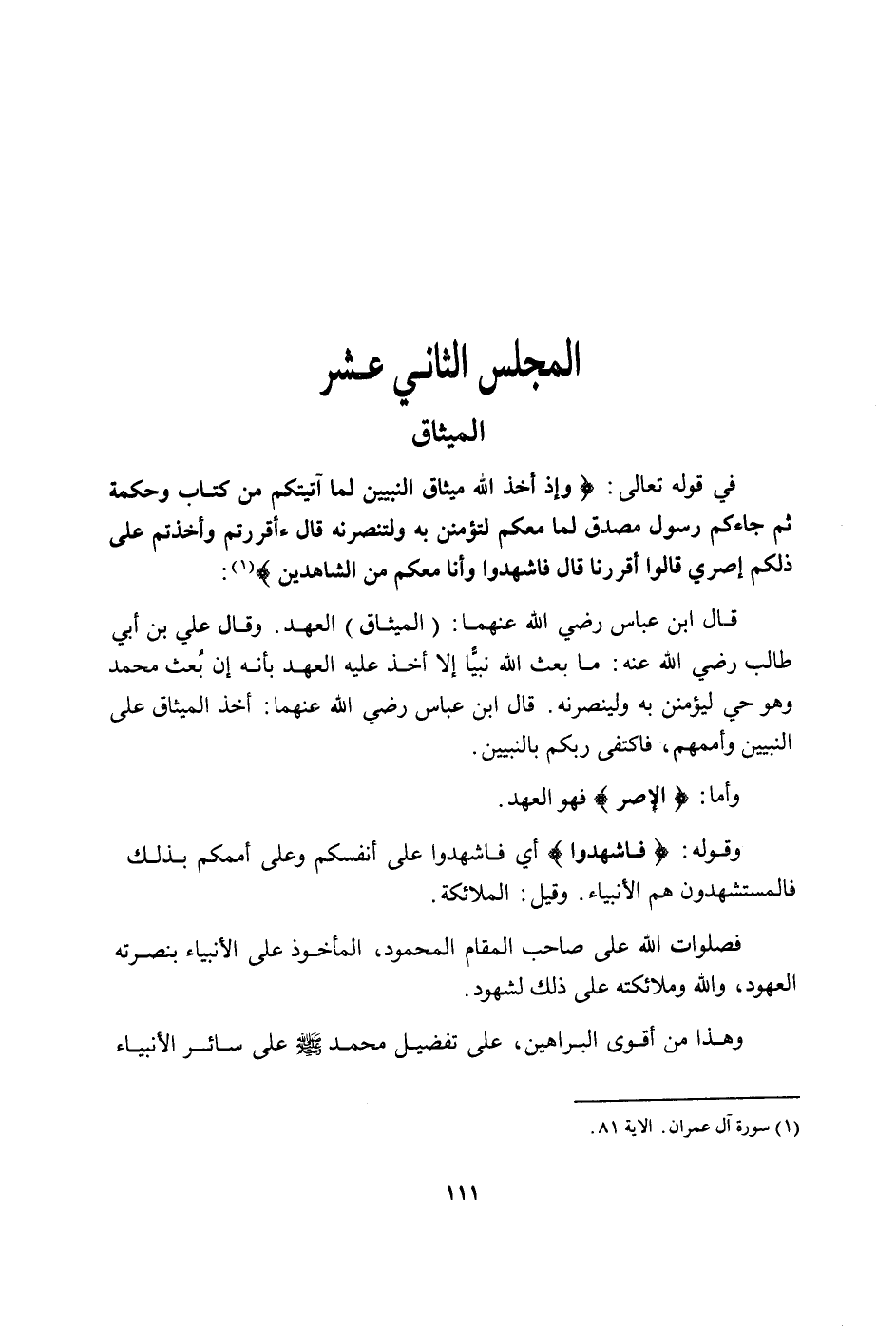 فِي قَوْله تَعَالَى وَإِذا أَخذ الله مِيثَاق النَّبِيين لما آتيتكم من كتاب وَحِكْمَة ثمَّ جَاءَكُم رَسُول مُصدق لما مَعكُمْ لتؤمنن بِهِ ولتنصرنه قَالَءَأَقْرَرْتُم وأخذتم على ذَلِكُم إصري قَالُوا أقررنا قَالَ فَاشْهَدُوا وانا مَعكُمْ من الشَّاهِدين قَالَ ابْن عَبَّاس رَضِي الله عَنْهُمَا الْمِيثَاق الْعَهْد وَقَالَ عَليّ بن أبي طَالب رَضِي الله عَنهُ مَا بعث الله نَبيا إِلَّا أَخذ عَلَيْهِ الْعَهْد بِأَنَّهُ بعث مُحَمَّد وَهُوَ حَيّ ليُؤْمِنن بِهِ ولينصرنه قَالَ ابْن عَبَّاس رَضِي الله عَنْهُمَا أَخذ الْمِيثَاق على النَّبِيين وأممهم فَاكْتفى ربكُم بالنبيين وَأما الإصر فَهُوَ الْعَهْد وَقَوله فَاشْهَدُوا أَي فَاشْهَدُوا على أَنفسكُم وعَلى أممكم بذلك فالمستشهدون هم الْأَنْبِيَاء وَقيل الْمَلَائِكَة فصلوات الله على صَاحب الْمقَام الْمَحْمُود الْمَأْخُوذ على الْأَنْبِيَاء بنصرته العهود وَالله وَمَلَائِكَته على ذَلِك لشهود وَهَذَا من أقوى الْبَرَاهِين على تَفْضِيل مُحَمَّد صلى الله عَلَيْهِ وَسلم على سَائِر الْأَنْبِيَاء