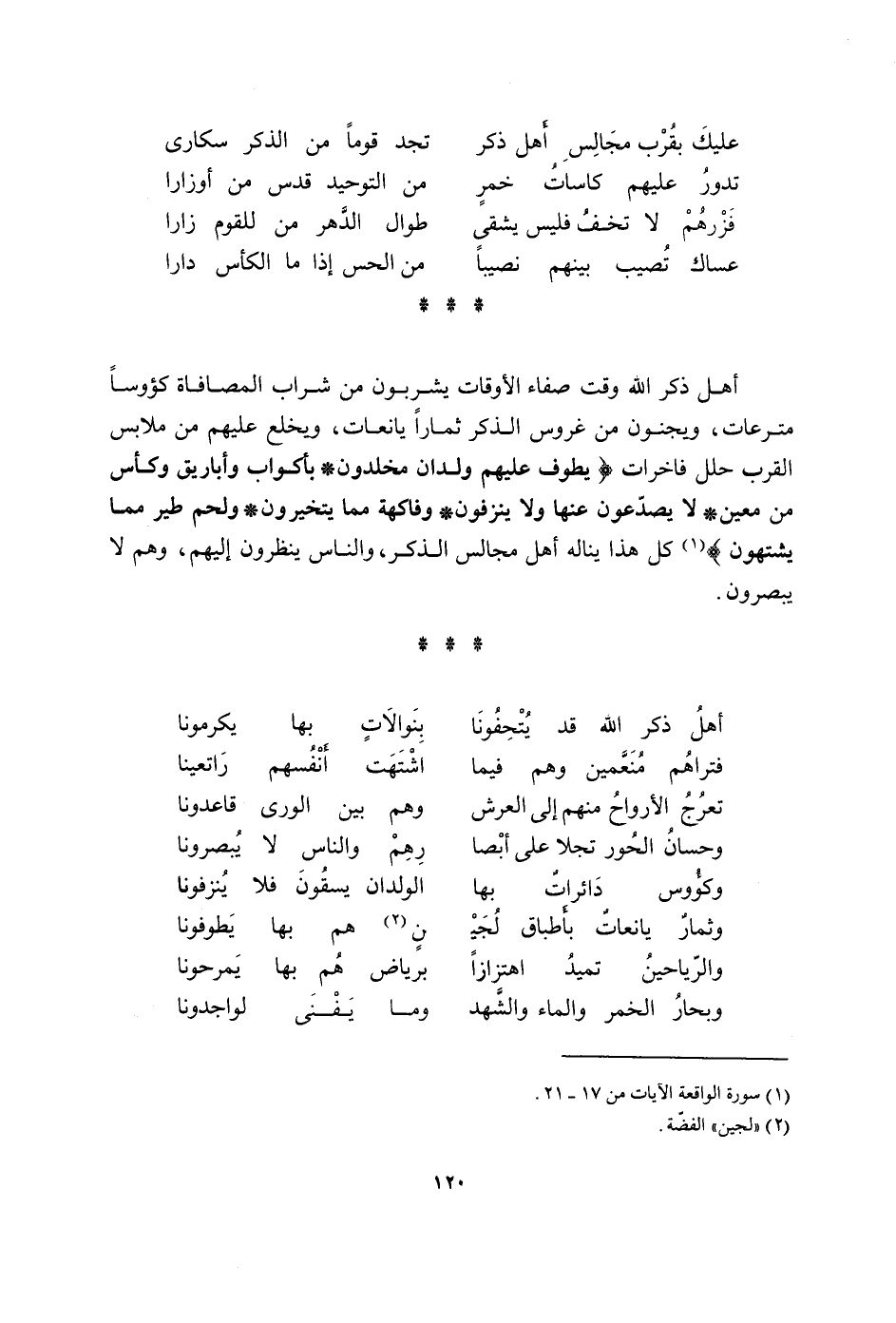 عَلَيْك بِقرب مجَالِس أهل ذكر تَجِد قوما من الذّكر سكارى تَدور عَلَيْهِم كاسات خمر من التَّوْحِيد قدس من أوزارا فزرهم لَا تخف فَلَيْسَ يشقى طوال الدَّهْر من للْقَوْم زارا عساك تصيب بَينهم نَصِيبا من الْحس إِذا مَا الكأس دَارا أهل ذكر الله وَقت صفاء الْأَوْقَات يشربون من شراب المصافاة كؤوسا مترعات ويجنون من غروس الذّكر ثمارا يانعات ويخلع عَلَيْهِم من ملابس الْقرب حلل فاخرات يطوف عَلَيْهِم ولدان مخلدون بأكواب وأباريق وكأس من معِين لَا يصدعون عَنْهَا وَلَا ينزفون وَفَاكِهَة مِمَّا يتخيرون وَلحم طير مِمَّا يشتهون كل هَذَا يَنَالهُ أهل مجَالِس الذّكر وَالنَّاس ينظرُونَ إِلَيْهِم وهم لَا يبصرون أهل ذكر الله قد يتحفونا بنوالات بهَا يكرمونا فتراهم منعمين وهم فِيمَا اشتهت أنفسهم راتعينا تعرج الْأَرْوَاح مِنْهُم إِلَى الْعَرْش وهم بَين الورى قاعدونا وَحسان الْحور تجلا على أبصا رهم وَالنَّاس لَا يبصرونا وكؤوس دائرات بهَا الْولدَان يسقون فَلَا ينزفونا وثمار يانعات بأطباق لجين هم بهَا يطوفونا والرياحين تميد اهتزازا برياض هم بهَا يمرحونا وبحار الْخمر وَالْمَاء والشهد وَمَا يفنى لواجدونا