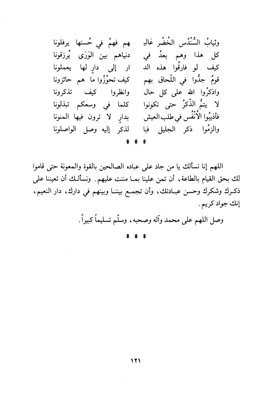 وَثيَاب السندس الْخضر عاليهم فهم فِي حسنها يرفلونا كل هَذَا وهم بعد فِي دنياهم بَين الورى يرزقونا كَيفَ لَو فارقوا هَذِه الد ار إِلَى دَار لَهَا يعملونا قوم جدوا فِي اللحاق بهم كَيفَ تحوزوا مَا هم حائزونا واذْكُرُوا الله على كل حَال وانظروا كَيفَ تذكرونا لَا يتم الذّكر حَتَّى تَكُونُوا كلما فِي وسعكم تبذلونا فأذيبوا الْأَنْفس فِي طلب الْعَيْش بدار لَا ترَوْنَ فِيهَا الْمنون والزموا ذكر الْجَلِيل فبا لذكر إِلَيْهِ وصل الواصلونا اللَّهُمَّ إِنَّا نَسْأَلك يَا من جاد على عباده الصَّالِحين بِالْقُوَّةِ والمعونة حَتَّى قَامُوا لَك بِحَق الْقيام بِالطَّاعَةِ ان تمن علينا بِمَا مننت عَلَيْهِم ونسألك أَن تعيننا على ذكرك وشكرك وَحسن عبادتك وَأَن تجمع بَيْننَا وَبينهمْ فِي دَارك دَار النَّعيم إِنَّك جواد كريم وصل الله على مُحَمَّد وَآله وَصَحبه وَسلم تَسْلِيمًا كَبِيرا