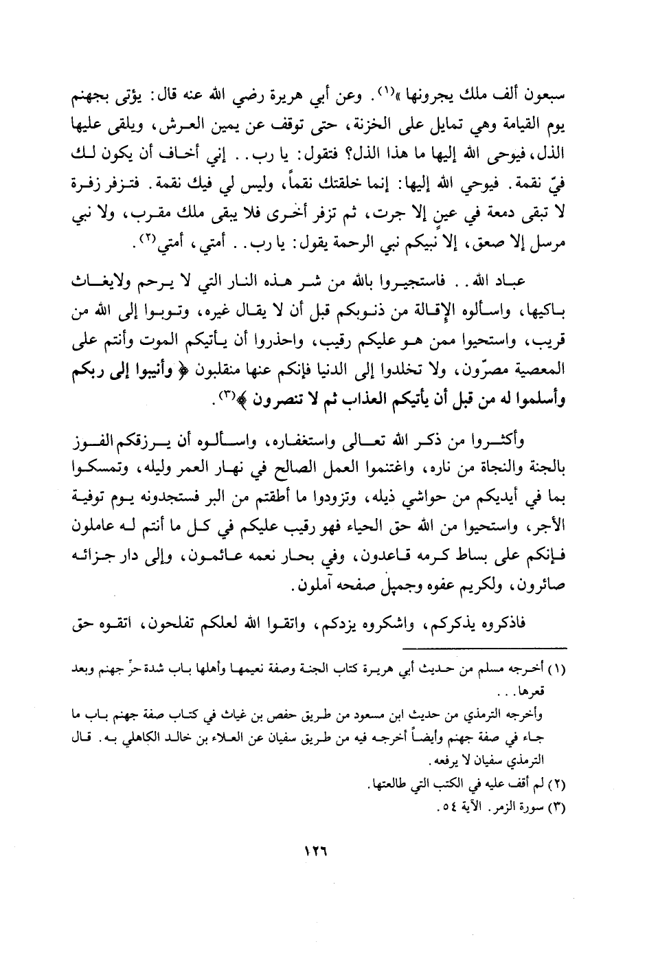 سَبْعُونَ ألف ملك يجرونها وَعَن أبي هُرَيْرَة رَضِي الله عَنهُ قَالَ يُؤْتى بجهنم يَوْم الْقِيَامَة وَهِي تمايل على الخزنة حَتَّى توقف عَن يَمِين الْعَرْش ويلقى عَلَيْهَا الذل فَيُوحِي الله إِلَيْهَا مَا هَذَا الذل فَتَقول يَا رب إِنِّي أَخَاف أَن يكون لَك فِي نقمة فَيُوحِي الله إِلَيْهَا إِنَّمَا خلقتك نقما وَلَيْسَ لي فِيك نقمة فتزفر زفرَة لَا تبقى دمعة فِي عين إِلَّا جرت ثمَّ تزفر أُخْرَى فَلَا يبْقى ملك مقرب وَلَا نَبِي مُرْسل إِلَّا صعق إِلَّا نَبِيكُم نَبِي الرَّحْمَة يَقُول يَا رب أمتِي أمتِي عباد الله فاستجيروا بِاللَّه من شَرّ هَذِه النَّار الَّتِي لَا يرحم وَلَا يغاث باكيها واسألوه الْإِقَالَة من ذنوبكم قبل ان لَا يُقَال غَيره وتوبوا إِلَى الله من قريب واستحيوا مِمَّن هُوَ عَلَيْكُم رَقِيب واحذروا أَن يأتيكم الْمَوْت وَأَنْتُم على الْمعْصِيَة مصرون وَلَا تخلدوا إِلَى الدُّنْيَا فَإِنَّكُم عَنْهَا منقلبون وأنيبوا إِلَى ربكُم وَأَسْلمُوا لَهُ قبل أَن يأتيكم الْعَذَاب ثمَّ لَا تنْصرُونَ وَأَكْثرُوا من ذكر الله تَعَالَى واستغفاره واسألوه أَن يرزقكم الْفَوْز بِالْجنَّةِ والنجاة من ناره واغتنموا الْعَمَل الصَّالح فِي نَهَار الْعُمر وليله وتمسكوا بِمَا فِي أَيْدِيكُم من حَوَاشِي ذيله وتزودوا مَا أطقتم من الْبر فستجدونه يَوْم توفيه الْأجر واستحيوا من الله حق الْحيَاء فَهُوَ رَقِيب عَلَيْكُم فِي كل مَا أَنْتُم لَهُ عاملون فَإِنَّكُم على بِسَاط كرمه قَاعِدُونَ وَفِي بحار نعمه عائمون وَإِلَى دَار جَزَائِهِ صائرون ولكريم عَفوه وَجَمِيل صفحه آملون فاذكروه يذكركم واشكروه يزدكم وَاتَّقوا الله لَعَلَّكُمْ تفلحون اتقوه حق