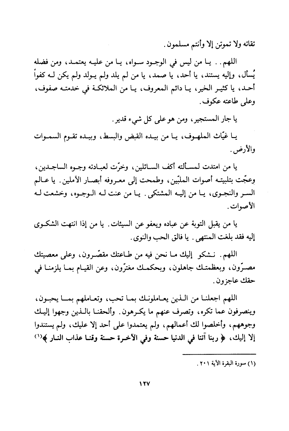 تُقَاته وَلَا تموتن إِلَّا وَأَنْتُم مُسلمُونَ اللَّهُمَّ يَا من لَيْسَ فِي الْوُجُود سواهُ يَا من عَلَيْهِ يعْتَمد وَمن فَضله يسْأَل وَإِلَيْهِ يسْتَند يَا أحد يَا صَمد يَا من لم يلد وَلم يُولد وَلم يكن لَهُ كفوا أحد يَا كثير الْخَيْر يَا دَائِم الْمَعْرُوف يَا من الْمَلَائِكَة فِي خدمته صُفُوف وعَلى طَاعَته عكوف يَا جَار المستجير وَمن هُوَ على كل شَيْء قدير يَا غياث الملهوف يَا من بِيَدِهِ الْقَبْض والبسط وَبِيَدِهِ تقوم السَّمَوَات وَالْأَرْض يَا من امتدت لمسألته أكف السَّائِلين وخرت لعبادته وُجُوه الساجدين وعجت بتلبيته أصوات الملبين وطمحت إِلَى معروفه أبصار الآملين يَا عَالم السِّرّ والنجوى يَا من إِلَيْهِ المشتكى يَا من عنت لَهُ الْوُجُوه وخشعت لَهُ الْأَصْوَات يَا من يقبل التَّوْبَة عَن عباده وَيَعْفُو عَن السَّيِّئَات يَا من إِذا انْتَهَت الشكوى إِلَيْهِ فقد بلغت الْمُنْتَهى يَا فالق الْحبّ والنوى اللَّهُمَّ نشكو إِلَيْك مَا نَحن فِيهِ من طَاعَتك مقصرون وعَلى معصيتك مصرون وبعظمتك جاهلون وبحكمك مغترون وَعَن الْقيام بِمَا يلْزمنَا فِي حَقك عاجزون اللَّهُمَّ اجْعَلْنَا من الَّذين يعاملونك بِمَا تحب وتعاملهم بِمَا يحبونَ وينصرفون عَمَّا تكره وَتصرف عَمَّا يكْرهُونَ وألحقنا بالذين وجهوا إِلَيْك وُجُوههم وَأَخْلصُوا لَك أَعْمَالهم وَلم يعتمدوا على أحد إِلَّا عَلَيْك وَلم يستندوا إِلَّا إِلَيْك رَبنَا آتنا فِي الدُّنْيَا حَسَنَة وَفِي الْآخِرَة حَسَنَة وقنا عَذَاب النَّار