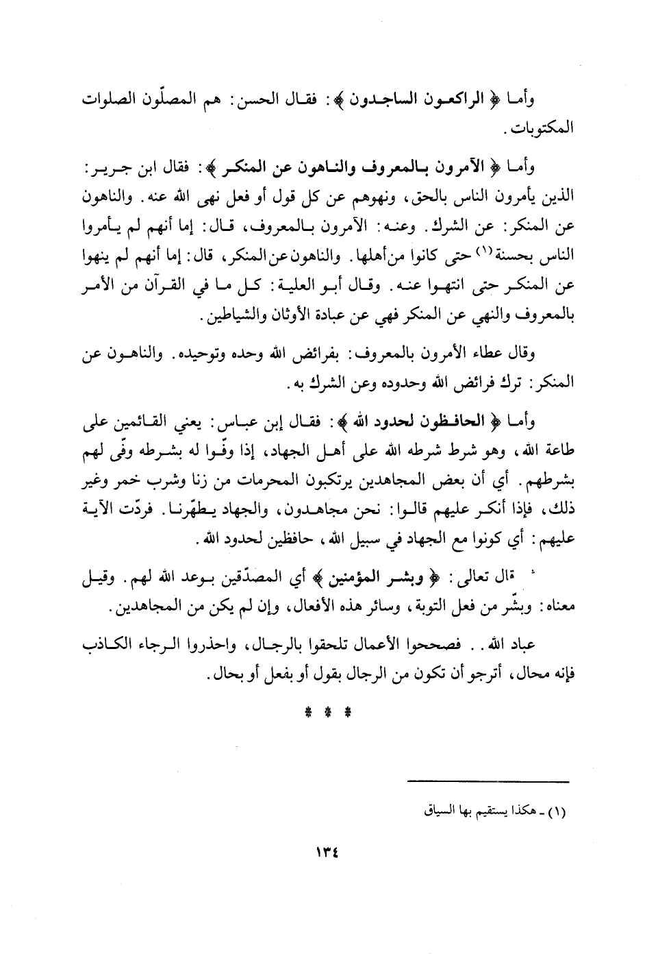وَأما الراكعون الساجدون فَقَالَ الْحسن هم المصلون الصَّلَوَات المكتوبات وَأما الآمرون بِالْمَعْرُوفِ والناهون عَن الْمُنكر فَقَالَ ابْن جرير الَّذين يأمرون النَّاس بِالْحَقِّ وَنَهَوْهُمْ عَن كل قَول اَوْ فعل نهى الله عَنهُ والناهون عَن الْمُنكر عَن الشّرك وَعنهُ الآمرون بِالْمَعْرُوفِ قَالَ إِمَّا انهم لم يأمروا النَّاس بحسنة حَتَّى كَانُوا من أَهلهَا والناهون عَن الْمُنكر قَالَ إِمَّا انهم لم ينهوا عَن الْمُنكر حَتَّى انْتَهوا عَنهُ وَقَالَ أَبُو الْعلية كل مَا فِي الْقُرْآن من الْأَمر بِالْمَعْرُوفِ وَالنَّهْي عَن الْمُنكر فَهِيَ من عبَادَة الْأَوْثَان وَالشَّيَاطِين وَقَالَ عَطاء الأمرون بِالْمَعْرُوفِ بفرائض الله وَحده وتوحيده والناهون عَن الْمُنكر ترك فَرَائض الله وحدوده وَعَن الشّرك بِهِ وَأما الحافظون لحدود الله فَقَالَ إِبْنِ عَبَّاس يَعْنِي القائمين على طَاعَة الله وَهُوَ شَرط شَرطه الله على أهل الْجِهَاد إِذْ وفوا لَهُ بِشَرْطِهِ وفى لَهُم بشرطهم أَي أَن بعض الْمُجَاهدين يرتكبون الْمُحرمَات من زنا وَشرب خمر وَغير ذَلِك فَإِذا أنكر عَلَيْهِم قَالُوا نَحن مجاهدون وَالْجهَاد يطهرنا فَردَّتْ الْآيَة عَلَيْهِم أَي كونُوا مَعَ الْجِهَاد فِي سَبِيل الله حافظين لحدود الله ثمَّ قَالَ تَعَالَى وَبشر الْمُؤمنِينَ أَي المصدقين بوعد الله لَهُم وَقيل مَعْنَاهُ وَبشر من فعل التَّوْبَة وَسَائِر هَذِه الْأَفْعَال وَإِن لم يكن من الْمُجَاهدين عباد الله فصححوا الْأَعْمَال تلحقوا بِالرِّجَالِ واحذروا الرَّجَاء الْكَاذِب فَإِنَّهُ محَال أترجو أَن تكون من الرِّجَال بقول اَوْ بِفعل أَو بِحَال
