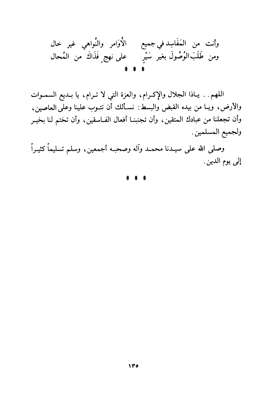 وَأَنت من الْمَفَاسِد فِي جَمِيع الْأَوَامِر والنواهي غير خَال وَمن طلب الْوُصُول بِغَيْر سير على نهج فَذَاك من الْمحَال اللَّهُمَّ يَا ذَا الْجلَال وَالْإِكْرَام والعزة الَّتِي لاترام يَا بديع السَّمَوَات وَالْأَرْض وَيَا من بِيَدِهِ الْقَبْض والبسط نَسْأَلك أَن تتوب علينا وعَلى العاصين وان تجعلنا من عِبَادك الْمُتَّقِينَ وان تجنبنا أَفعَال الْفَاسِقين وَأَن تختم لنا بِخَير وَلِجَمِيعِ الْمُسلمين وَصلى الله على سيدنَا مُحَمَّد وَآله وَصَحبه أَجْمَعِينَ وَسلم تَسْلِيمًا كثيرا إِلَى يَوْم الدّين
