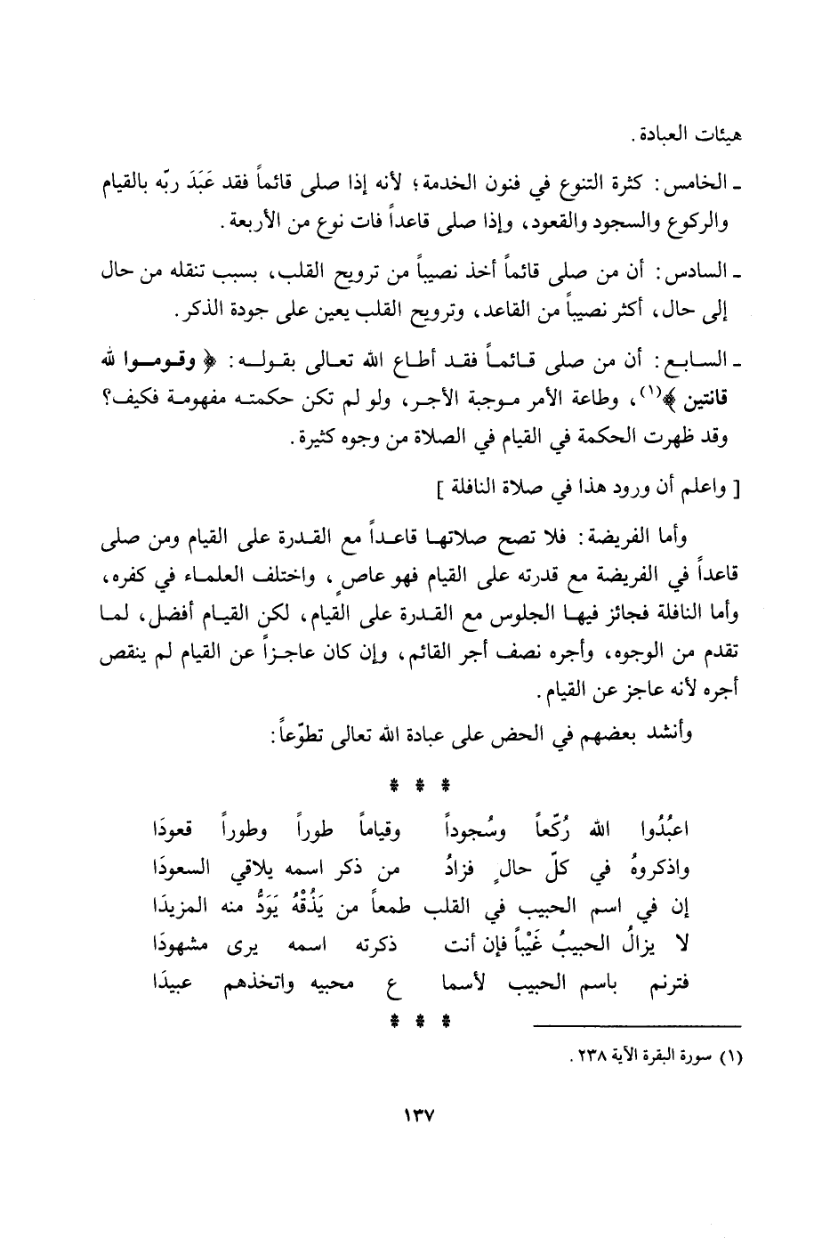 هيئات الْعِبَادَة الْخَامِس كَثْرَة التنوع فِي فنون الْخدمَة لِأَنَّهُ إِذا صلى قَائِما فقد عبد ربه بِالْقيامِ وَالرُّكُوع وَالسُّجُود وَالْقعُود وَإِذا صلى قَاعِدا فَاتَ نوع من الْأَرْبَعَة السَّادِس أَن من صلى قَائِما أَخذ نَصِيبا من ترويح الْقلب بِسَبَب تنقله من حَال إِلَى حَال أَكثر نَصِيبا من الْقَاعِد وترويح الْقلب يعين على جودة الذّكر السَّابِع أَن من صلى قَائِما فقد أطَاع الله تَعَالَى بقوله وَقومُوا لله قَانِتِينَ وَطَاعَة الْأَمر مُوجبَة الْأجر وَلَو لم تكن حكمته مَفْهُومه فَكيف وَقد ظَهرت الْحِكْمَة فِي الْقيام فِي الصَّلَاة من وُجُوه كَثِيرَة وَاعْلَم أَن وُرُود هَذَا فِي صَلَاة النَّافِلَة وَأما الْفَرِيضَة فَلَا تصح صلَاتهَا قَاعِدا مَعَ الْقُدْرَة على الْقيام وَمن صلى قَاعِدا فِي الْفَرِيضَة مَعَ قدرته على الْقيام فَهُوَ عَاص وَاخْتلف الْعلمَاء فِي كفره وَأما النَّافِلَة فَجَائِز فِيهَا الْجُلُوس مَعَ الْقُدْرَة على الْقيام لَكِن الْقيام أفضل لما تقدم من الْوُجُوه وأجره نصف أجر الْقَائِم وَإِن كَانَ عَاجِزا عَن الْقيام لم ينقص أجره لِأَنَّهُ عَاجز عَن الْقيام وَأنْشد بَعضهم فِي الحض على عبَادَة الله تَعَالَى تَطَوّعا اعبدوا الله ركعا وسجودا وقياما طورا وطورا قعُودا واذكروه فِي كل حَال فَزَاد من ذكر إسمه يلقِي السعودا إِن فِي اسْم الحبيب فِي الْقلب طَمَعا من يذقه يود مِنْهُ المزيدا لَا يزَال الحبيب غيبا فَإِن أَنْت ذكرته اسْمه يرى مشهودا فترنم باسم الحبيب لأسما ع محبيه واتخذهم عبيدا