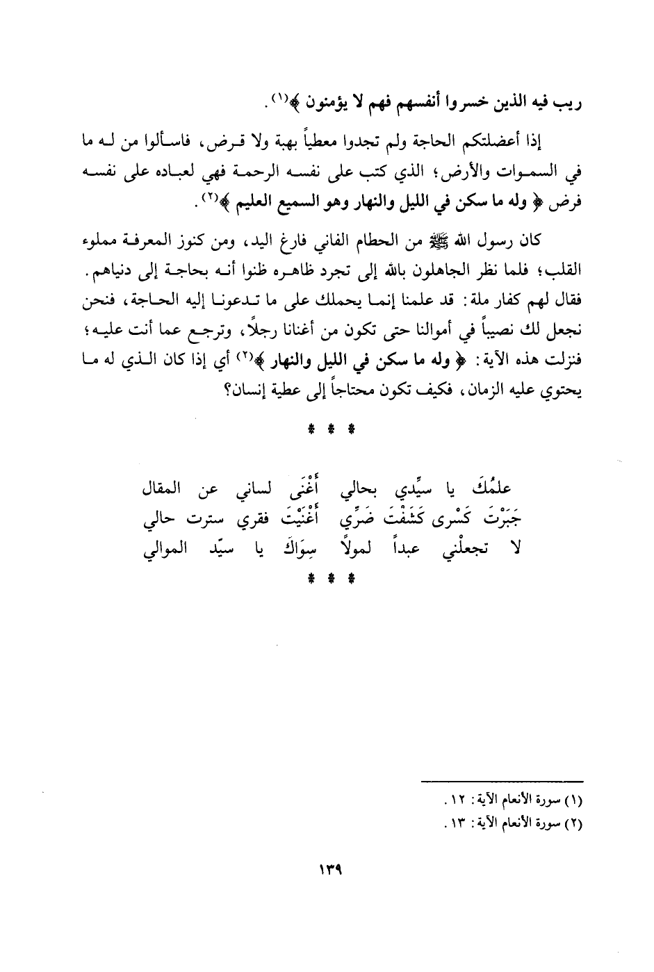ريب فِيهِ الَّذين خسروا أنفسهم فهم لَا يُؤمنُونَ إِذا أعضلتكم الْحَاجة وَلم تَجدوا مُطيعًا بِهِبَة وَلَا قرض فاسألوا من لَهُ مَا فِي السَّمَوَات وَالْأَرْض الَّذِي كتب على نَفسه الرَّحْمَة فَهِيَ لِعِبَادِهِ على نَفسه فرضوله مَا سكن فِي اللَّيْل وَالنَّهَار وَهُوَ السَّمِيع الْعَلِيم كَانَ رَسُول الله صلى الله غليه وَسلم من الحطام الفاني فارغ الْيَد وَمن كنوز الْمعرفَة مَمْلُوء الْقلب فَلَمَّا نظر الجاهلون بِاللَّه إِلَى تجرد ظَاهره ظنُّوا أَنه بحاجة دنياهم فَقَالَ لَهُم كفار مِلَّة قد علمنَا إِنَّمَا يحملك على مَا تدعونا إِلَيْهِ الْحَاجة فَنحْن نجْعَل لَك نَصِيبا فِي أَمْوَالنَا حَتَّى تكون من أغنانا رجلا وَترجع عَمَّا انت عَلَيْهِ فَنزلت هَذِه الْآيَة وَله مَا سكن فِي اللَّيْل وَالنَّهَار أَي إِذا كَانَ الَّذِي لَهُ مَا يحتوي عَلَيْهِ الزَّمَان فَكيف تكون مُحْتَاجا إِلَى عَطِيَّة إِنْسَان علمك يَا سَيِّدي بحالي أغْنى لساني عَن الْمقَال جبرت كسْرَى كشفت ضري أغنيت فقري سترت حَالي لَا تجعلني عبدا لمولا سواك يَا سيد الموَالِي