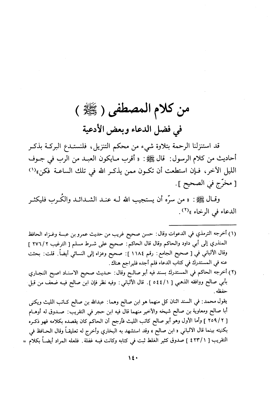 قد استنزلنا الرَّحْمَة بِتِلَاوَة شَيْء من مُحكم التَّنْزِيل فلنستدع الْبركَة بِذكر أَحَادِيث من كَلَام الرَّسُول قَالَ صلى الله عَلَيْهِ وَسلم أقرب مَا يكون العَبْد من الرب فِي جَوف اللَّيْل الآخر فَإِن اسْتَطَعْت أَن تكون مِمَّن يذكر الله فِي تِلْكَ السَّاعَة فَكُن مخرج فِي الصَّحِيح وَقَالَ صلى الله عَلَيْهِ وَسلم من سره أَن يستجيب الله لَهُ عِنْد الشدائد وَالْكرب فليكثر الدُّعَاء فِي الرخَاء