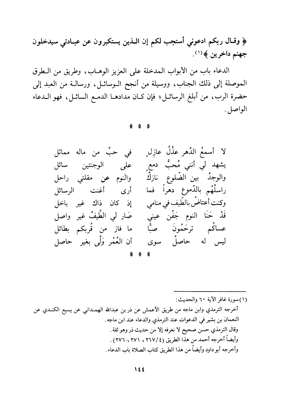 وَقَالَ ربكُم ادْعُونِي أَسْتَجِب لكم إِن الَّذين يَسْتَكْبِرُونَ عَن عبادتي سيدخلون جَهَنَّم داخرين الدُّعَاء بَاب من الْأَبْوَاب المدخلة على الْعَزِيز الْوَهَّاب وَطَرِيق من الطّرق الموصلة إِلَى ذَلِك الجناب ووسيلة من أنجح الْوَسَائِل ورسالة من العَبْد إِلَى حَضْرَة الرب من أبلغ الرسائل فَإِن كَانَ مدادها الدمع السَّائِل فَهُوَ الدُّعَاء الْوَاصِل لَا أسمع الدَّهْر عذل عازل فِي حب من مَاله مماثل يشْهد لي أنني محب دمع على الوجنتين سَائل والوجد بَين الضلوع نازك وَالنَّوْم عَن مقلتي راحل راسلهم بالدموع دهرا فَمَا أرى أغنت الرسائل وَكنت أعتاض بالطيف فِي مَنَامِي إذكان ذالك غير باخل قد حنا النّوم جفن عَيْني صَار لي الطيف غير وَاصل عساكم ترحمون صبا مَا فَازَ من قربكم بطائل لَيْسَ لَهُ حَاصِل سوى أَن عمر ولي بِغَيْر حَاصِل